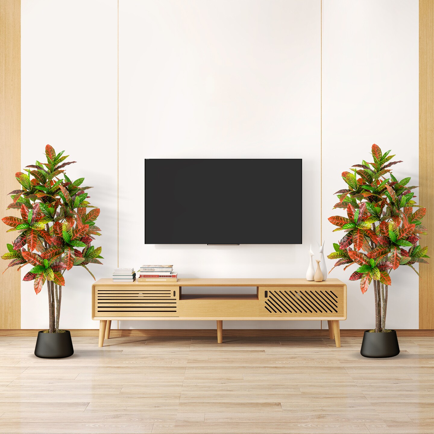 Green Artificial Croton Tree with Pot and Real Wood Trunk