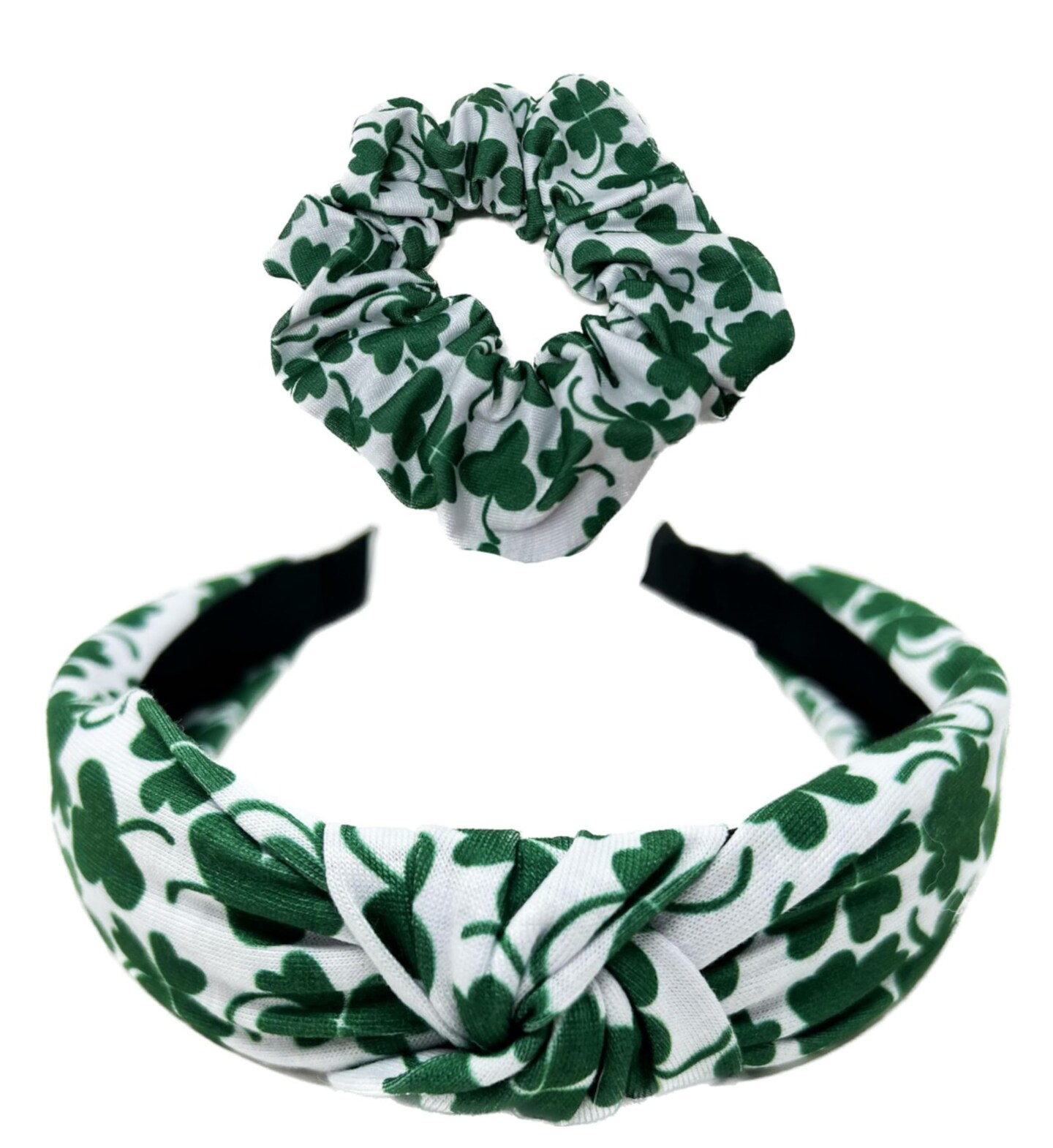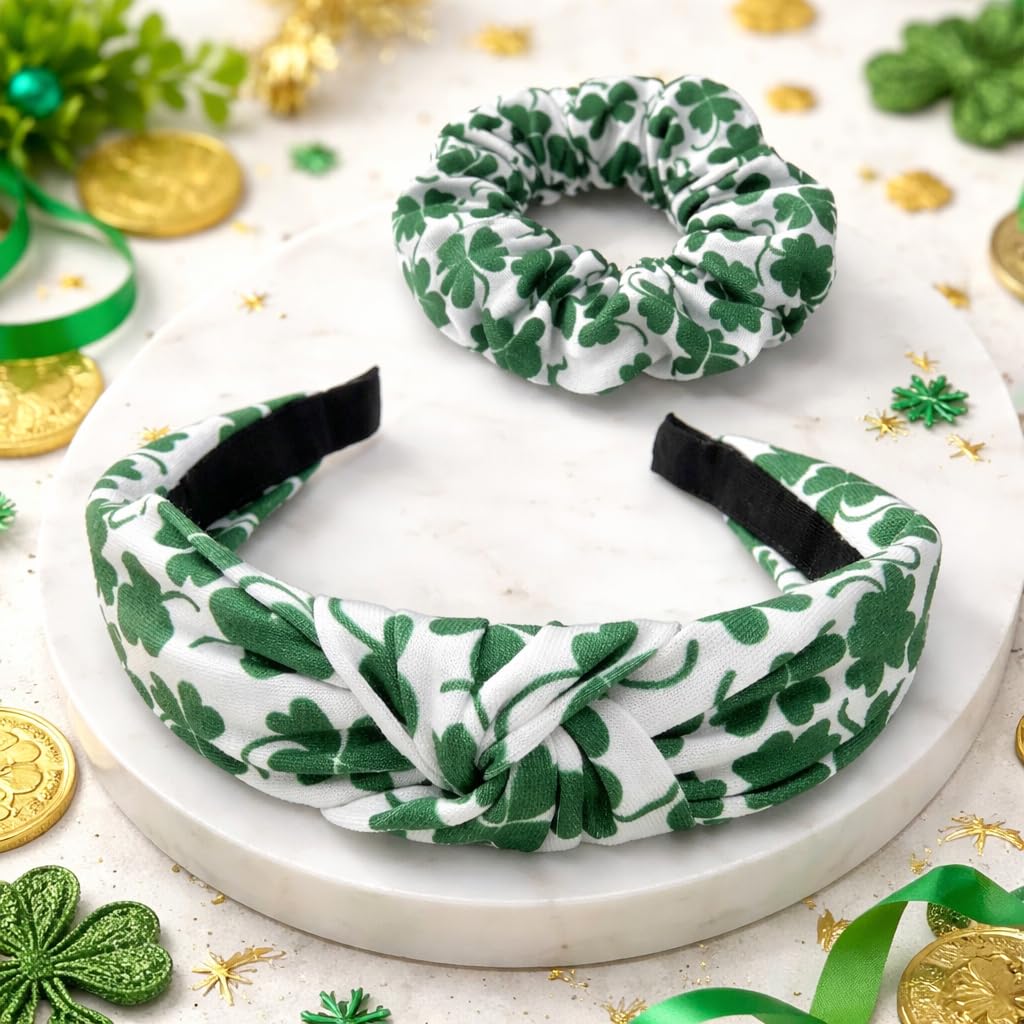 Green Clover Headband & Scrunchie Set – Shamrock Hair Accessories for Women & Girls, St. Patrick’s Day Style