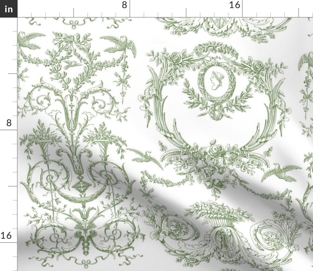 Green Damask Toile And White Romantic Rococo French Regency Georgian Custom Printed Fabric by Spoonflower Various Fabrics by the Yard or Fat Quarter