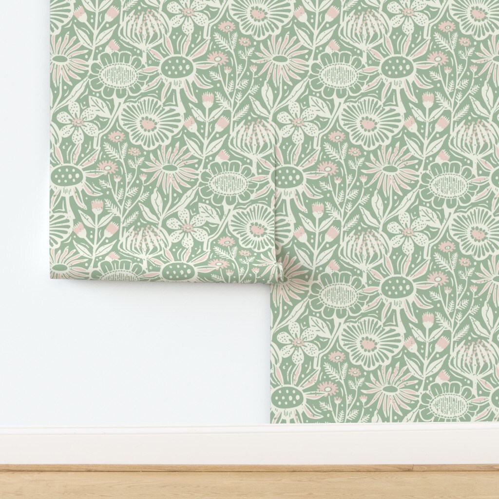 Green Floral Pink Botanical Summer Scandinavian Block Print Farmhouse Cottagecore Wildflowers Custom Pre-pasted Wallpaper by Spoonflower Pre-Pasted Wallpaper 2FT Wide
