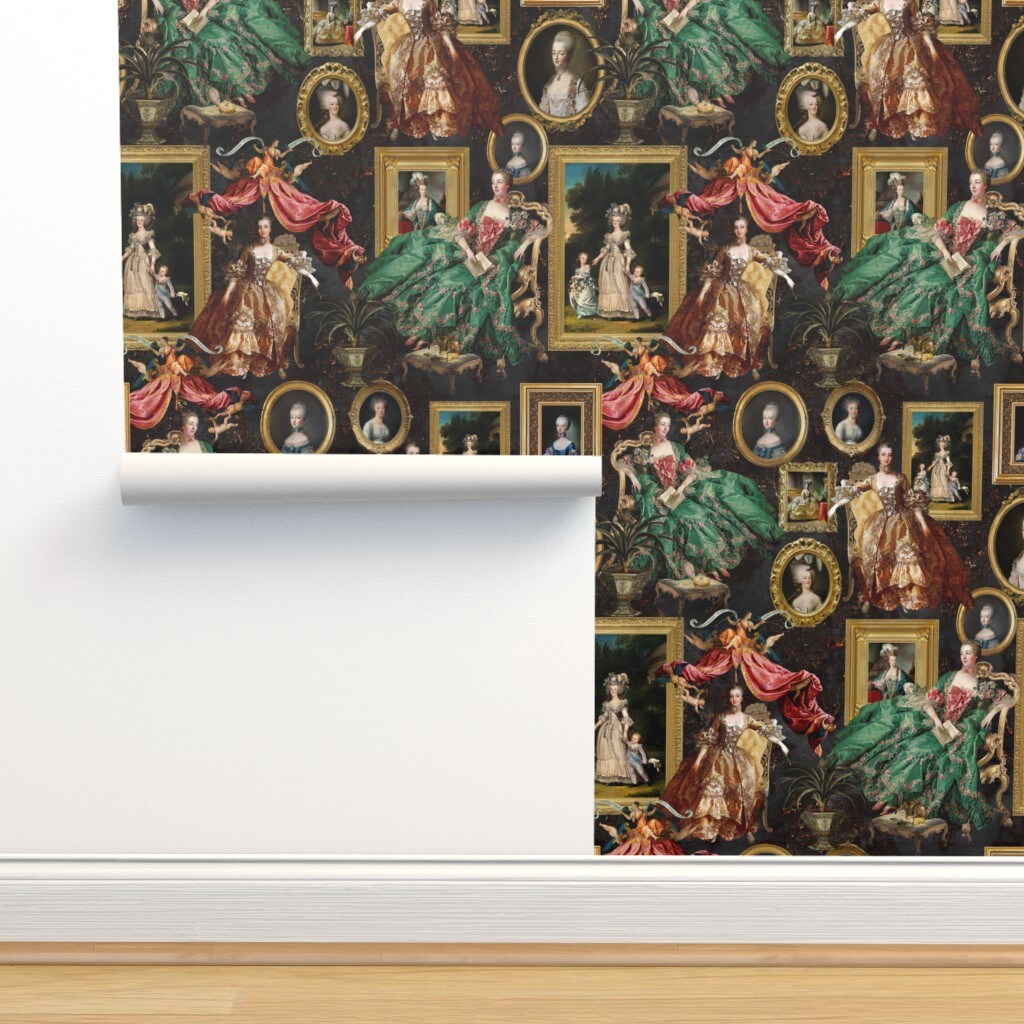 Green French Toile Rococo Queen Baroque Frames Museum History Large Scale Portraiture Neoclassical Custom Pre-pasted Wallpaper by Spoonflower Pre-Pasted Wallpaper 2FT Wide