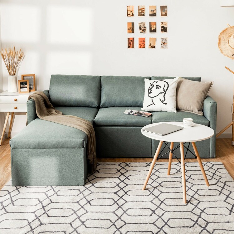Green Linen Modular L-Shaped Sectional Sofa with Ottoman and Removable Covers