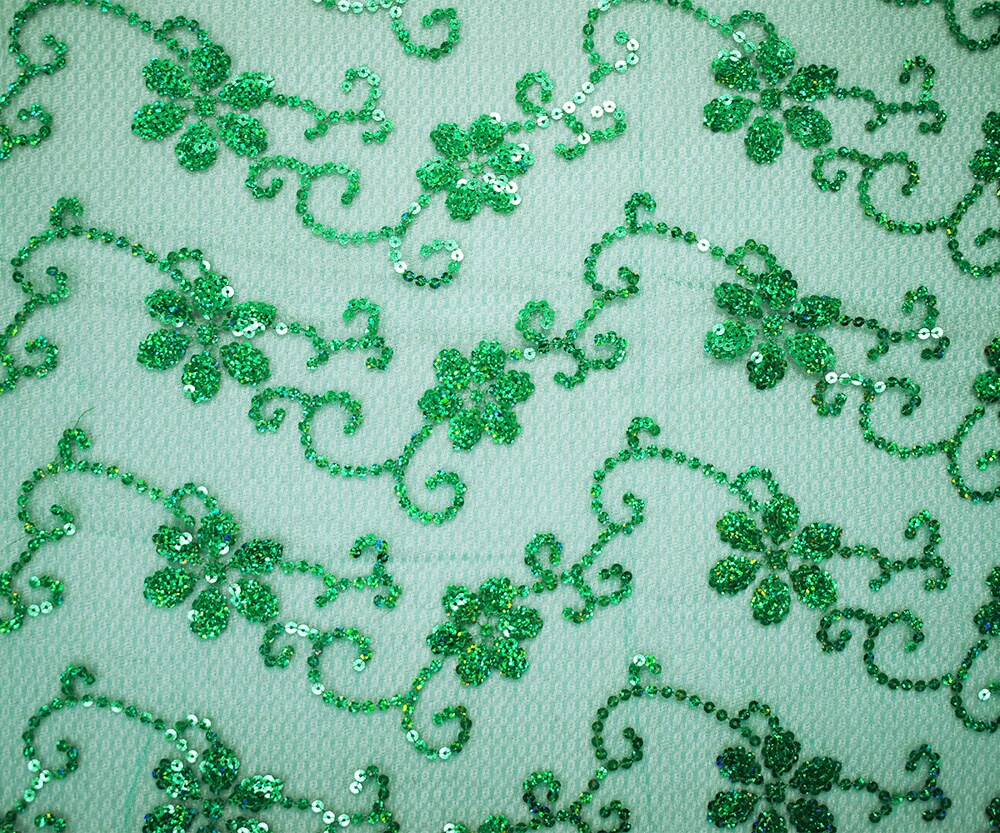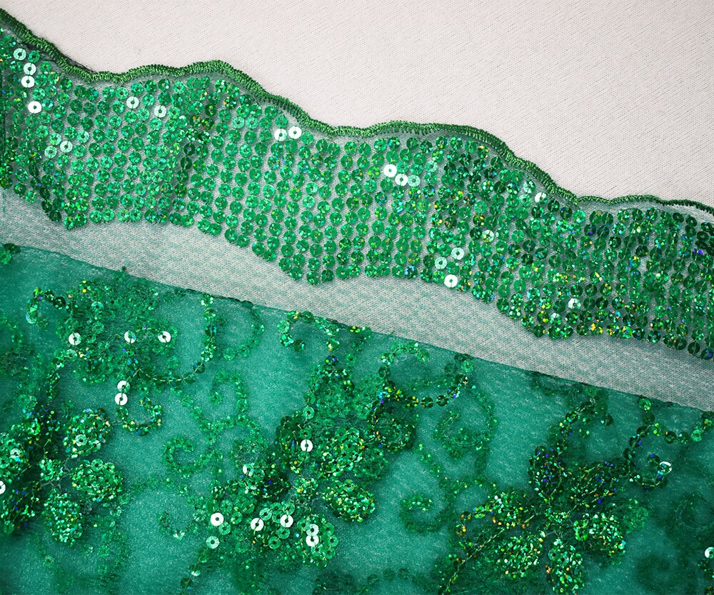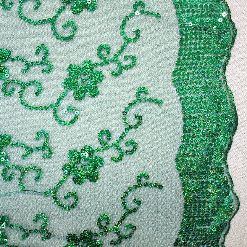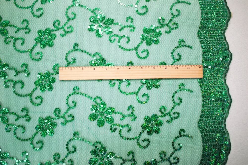 Green Nylon Embroidered Floral Sequin Scallop Tulle Mesh Fabric By the Yard