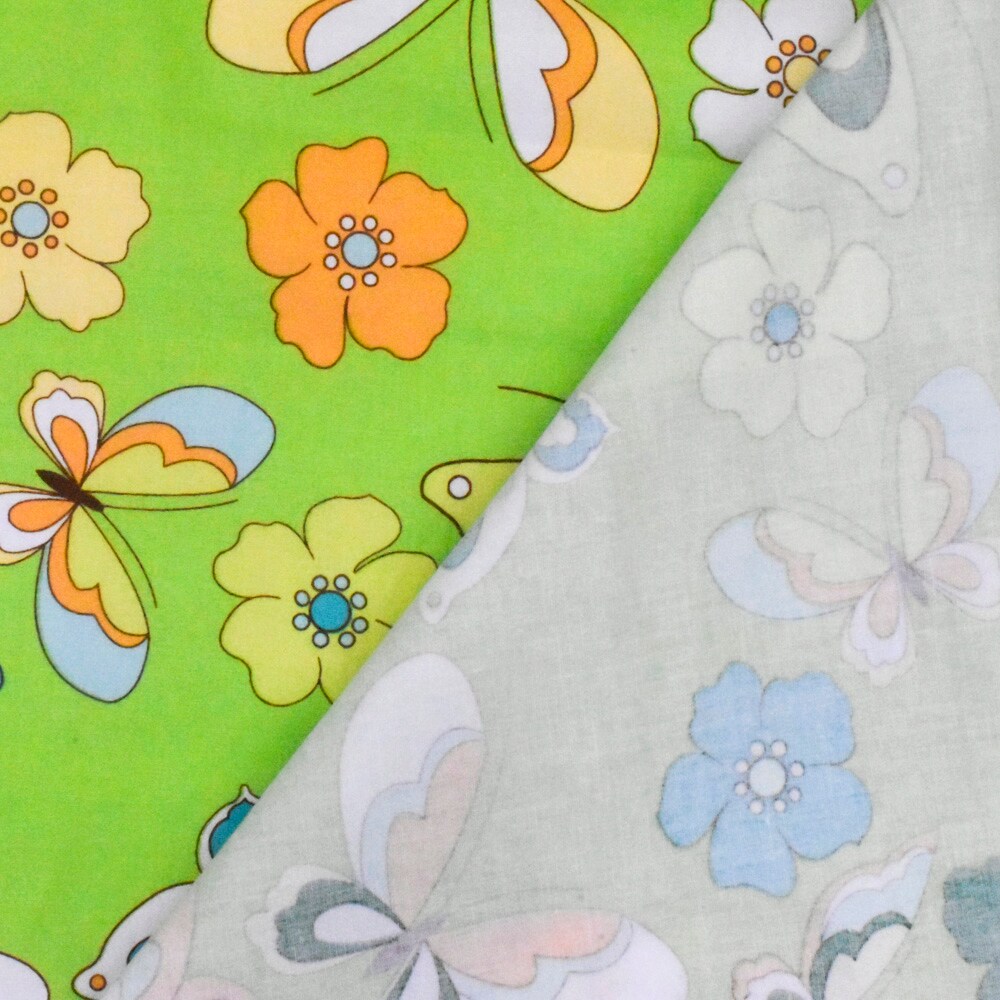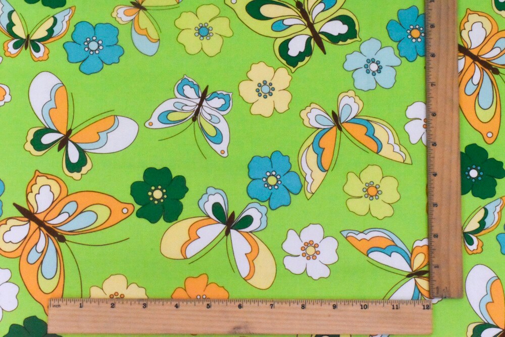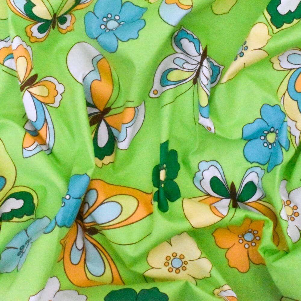 Green-Multi Floral Butterfly Print Stretch Cotton Poplin Fabric By the Yard