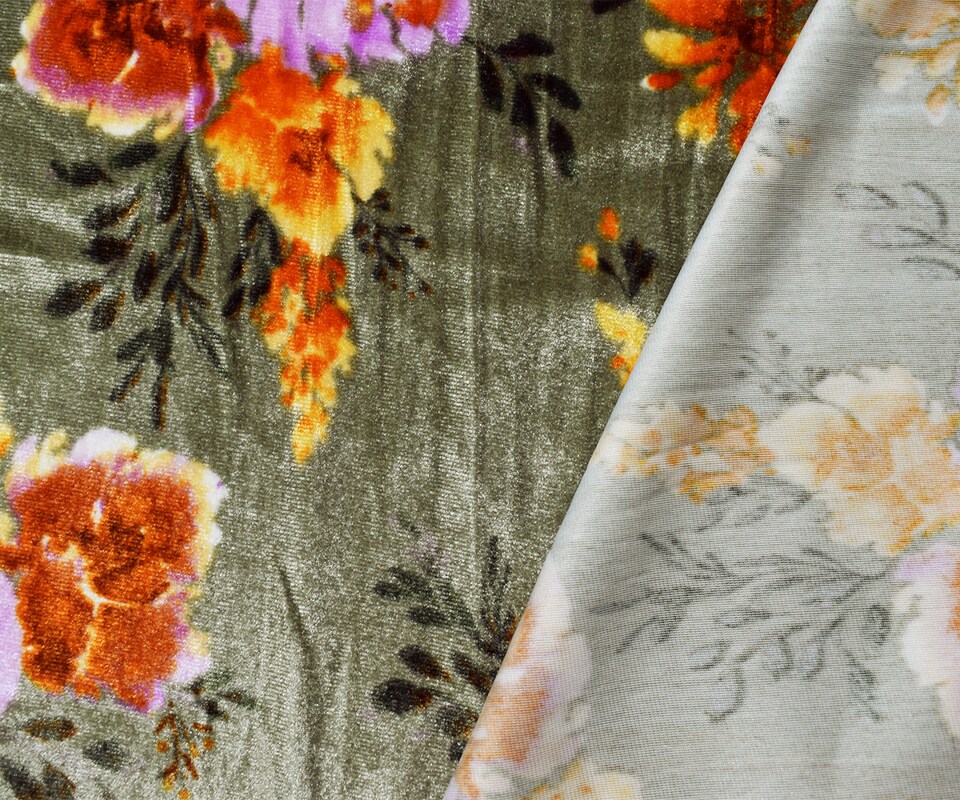 Green-Orange-Multi Poly Stretch Spandex Floral Printed Velvet Knit Fabric By the Yard