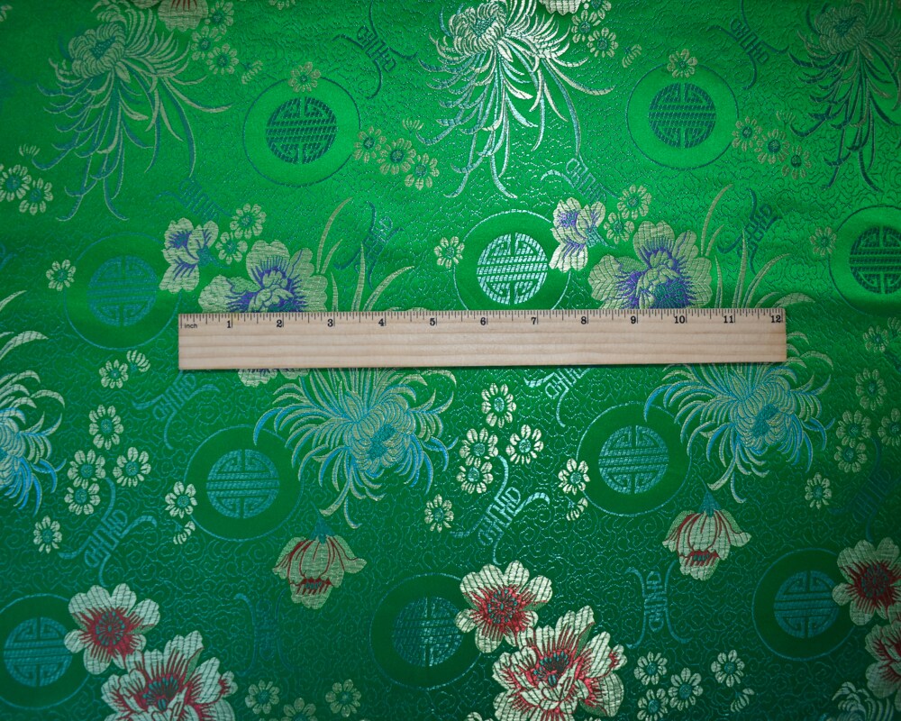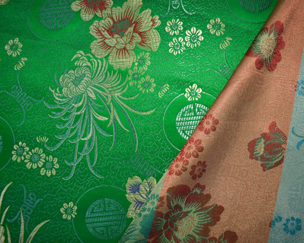 Green-Yellow-Multi Polyester Floral Chinese Brocade Woven Fabric By the Yard