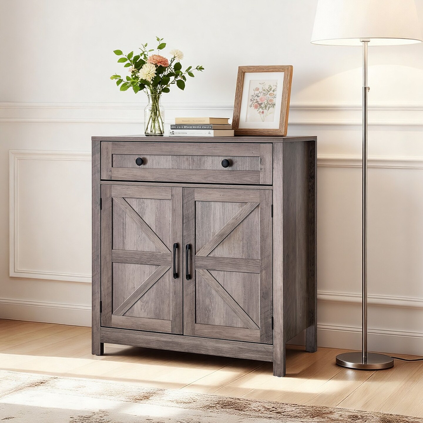 Grey Farmhouse Coffee Bar Cabinet with Drawer and 2 Barn Doors Sideboard