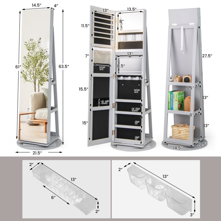 Grey MDF Jewelry Cabinet with Full-Length Mirror and LED Lights