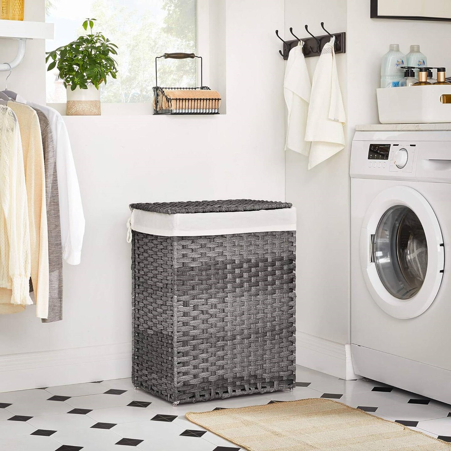 Grey Rattan Plastic Laundry Hamper with Lid, Cotton Liner and Iron Frame