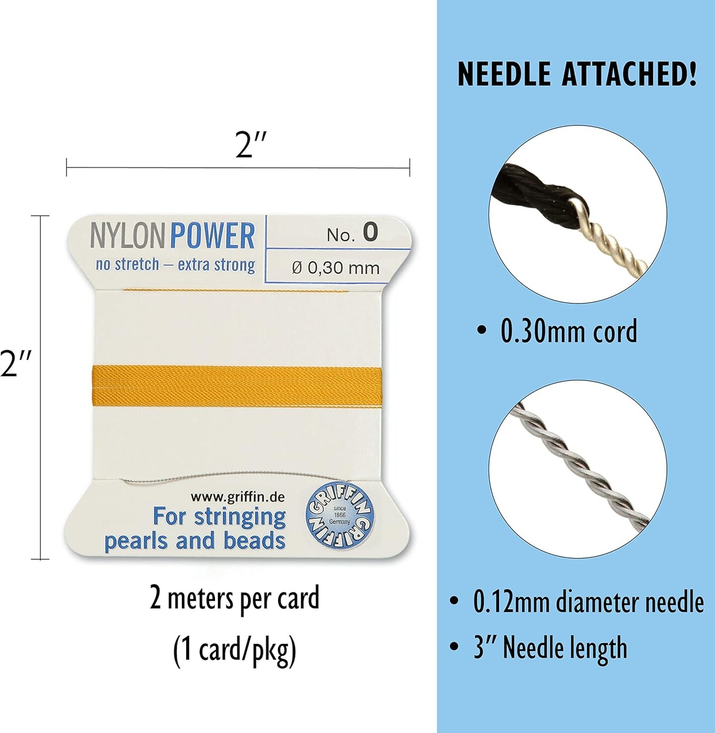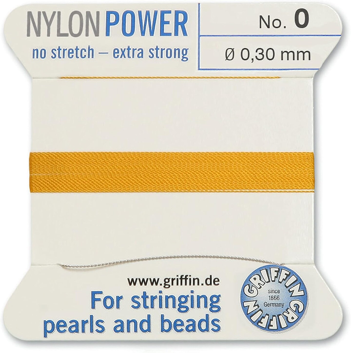 Griffin Nylon Bead Cord Perlseide – Size 0 (0.30mm) – 2 Meters per Card – Stainless Steel Needle Attached – for Knotting Pearls, Gemstones, Crystals and Beads