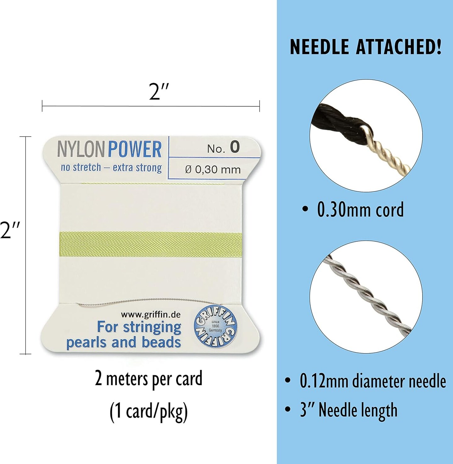 Griffin Nylon Bead Cord Perlseide – Size 0 (0.30mm) – 2 Meters per Card – Stainless Steel Needle Attached – for Knotting Pearls, Gemstones, Crystals and Beads