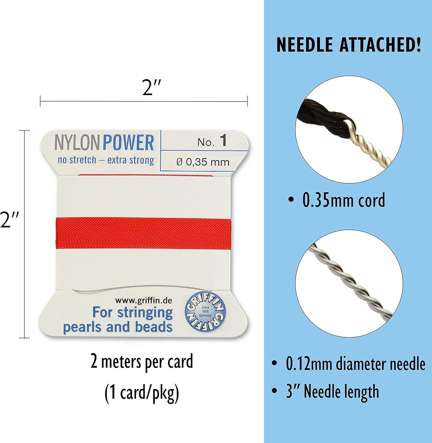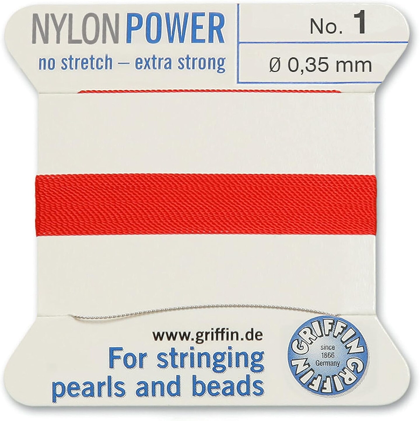 Griffin Nylon Bead Cord Perlseide – Size 1 (0.35mm) – 2 Meters per Card – Stainless Steel Needle Attached – for Knotting Pearls, Gemstones, Crystals and Beads