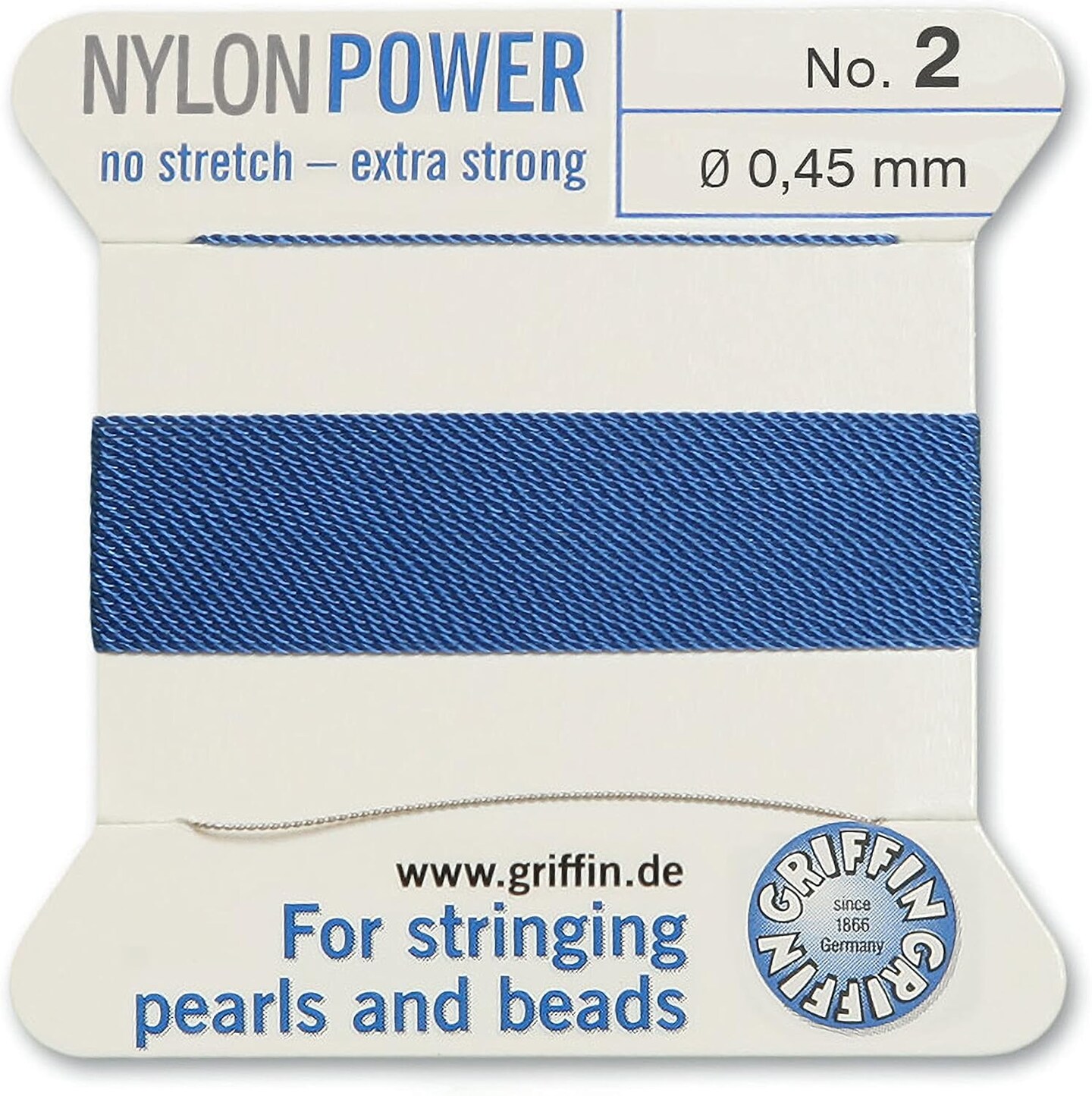 Griffin Nylon Bead Cord Perlseide – Size 2 (0.45mm) – 2 Meters per Card – Stainless Steel Needle Attached – for Knotting Pearls, Gemstones, Crystals and Beads