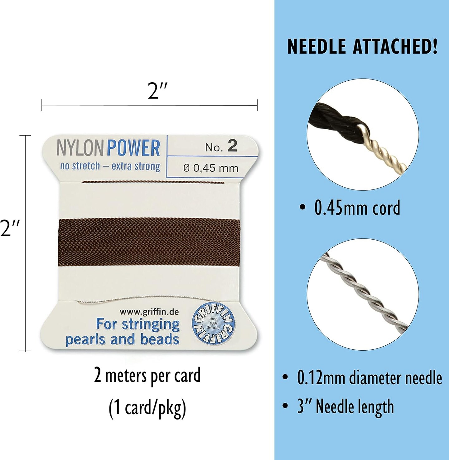 Griffin Nylon Bead Cord Perlseide – Size 2 (0.45mm) – 2 Meters per Card – Stainless Steel Needle Attached – for Knotting Pearls, Gemstones, Crystals and Beads