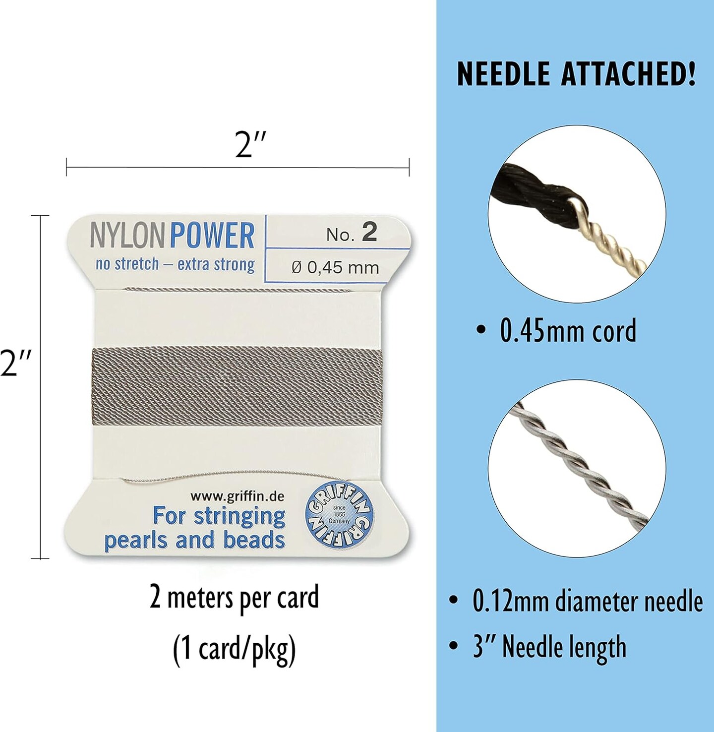 Griffin Nylon Bead Cord Perlseide – Size 2 (0.45mm) – 2 Meters per Card – Stainless Steel Needle Attached – for Knotting Pearls, Gemstones, Crystals and Beads