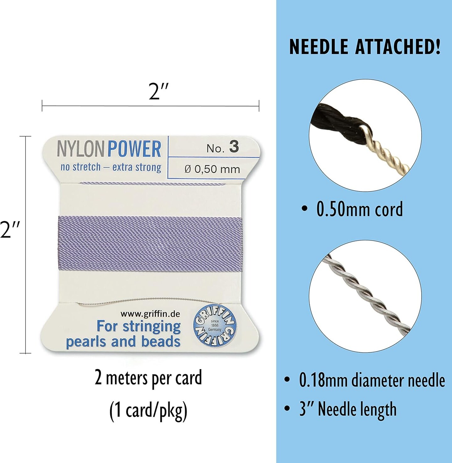 Griffin Nylon Bead Cord Perlseide – Size 3 (0.50mm) – 2 Meters per Card – Stainless Steel Needle Attached – for Knotting Pearls, Gemstones, Crystals and Beads