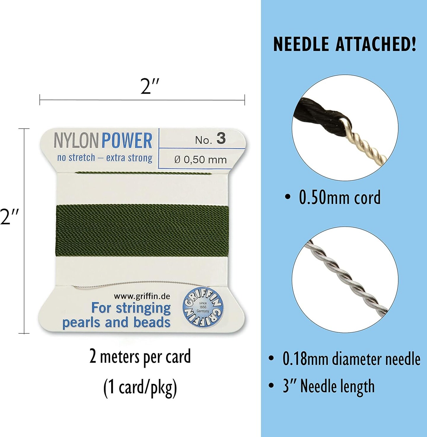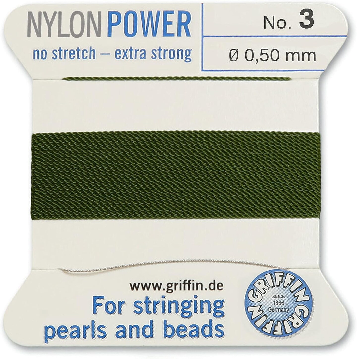 Griffin Nylon Bead Cord Perlseide – Size 3 (0.50mm) – 2 Meters per Card – Stainless Steel Needle Attached – for Knotting Pearls, Gemstones, Crystals and Beads