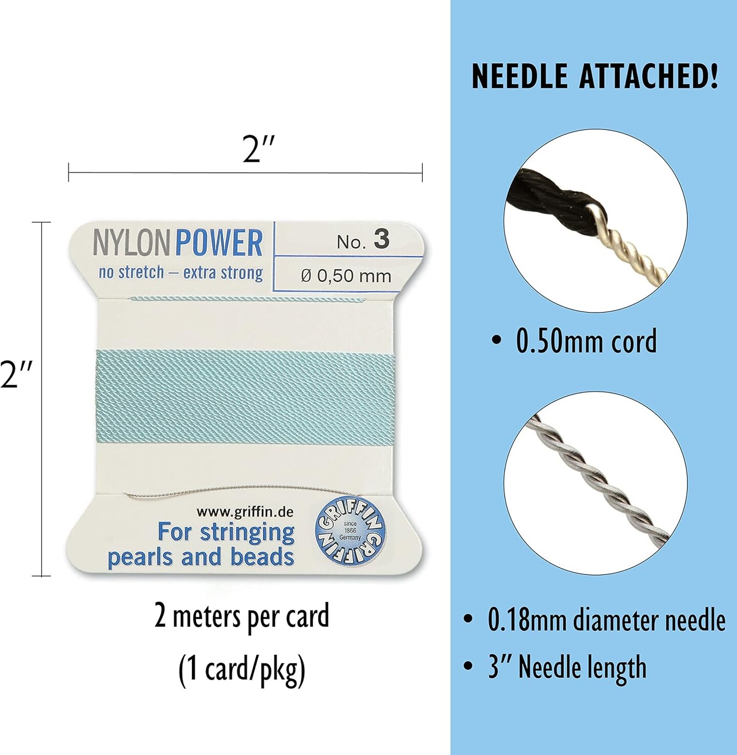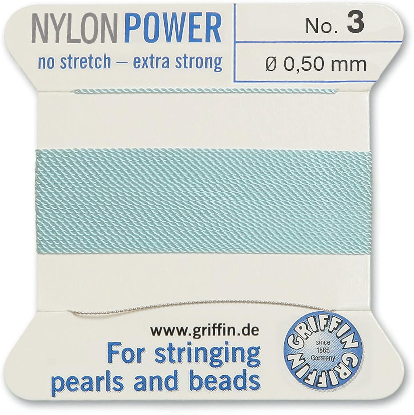 Griffin Nylon Bead Cord Perlseide – Size 3 (0.50mm) – 2 Meters per Card – Stainless Steel Needle Attached – for Knotting Pearls, Gemstones, Crystals and Beads