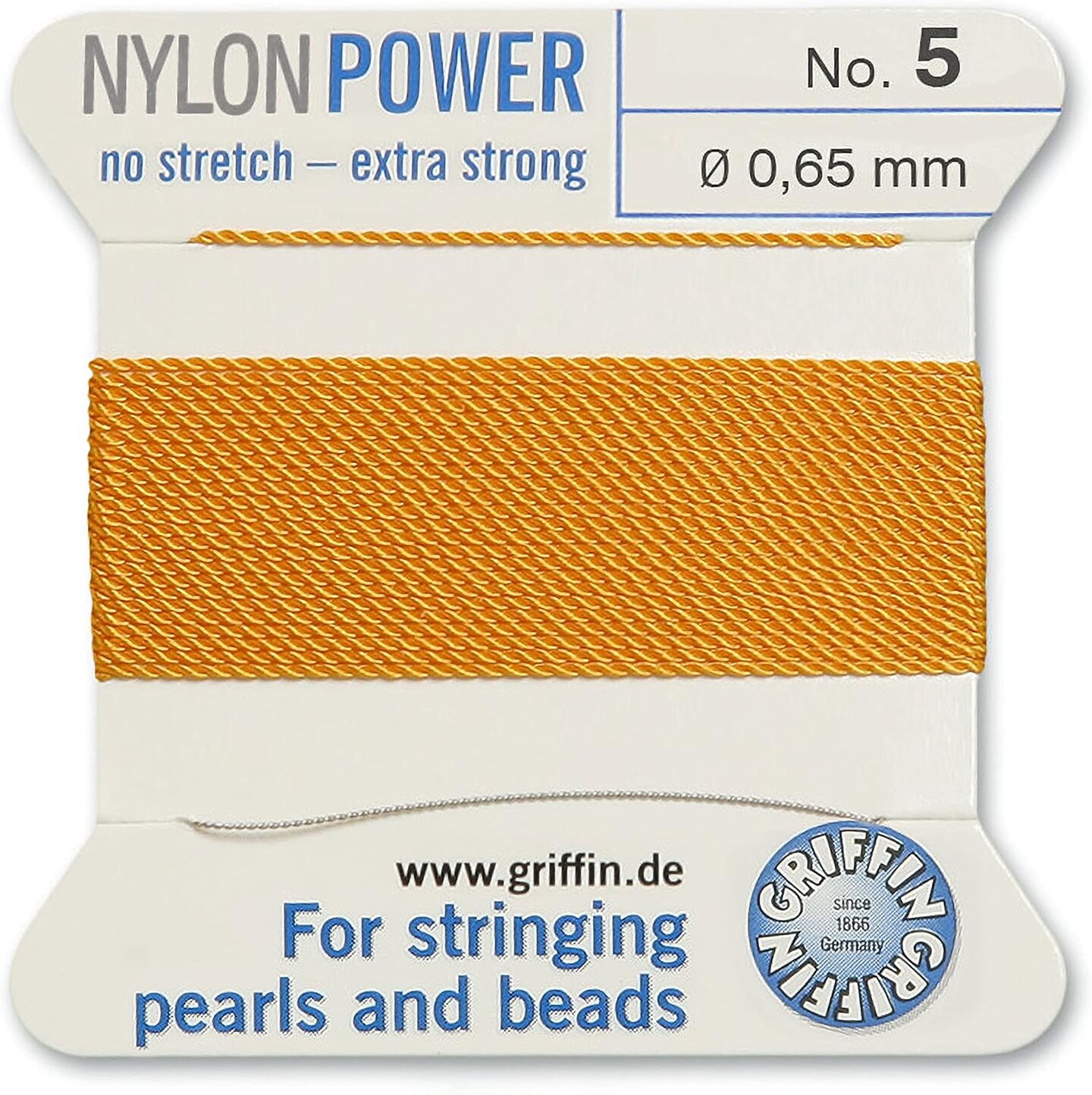 Griffin Nylon Bead Cord Perlseide – Size 5 (0.65mm) – 2 Meters per Card – Stainless Steel Needle Attached – for Knotting Pearls, Gemstones, Crystals and Beads