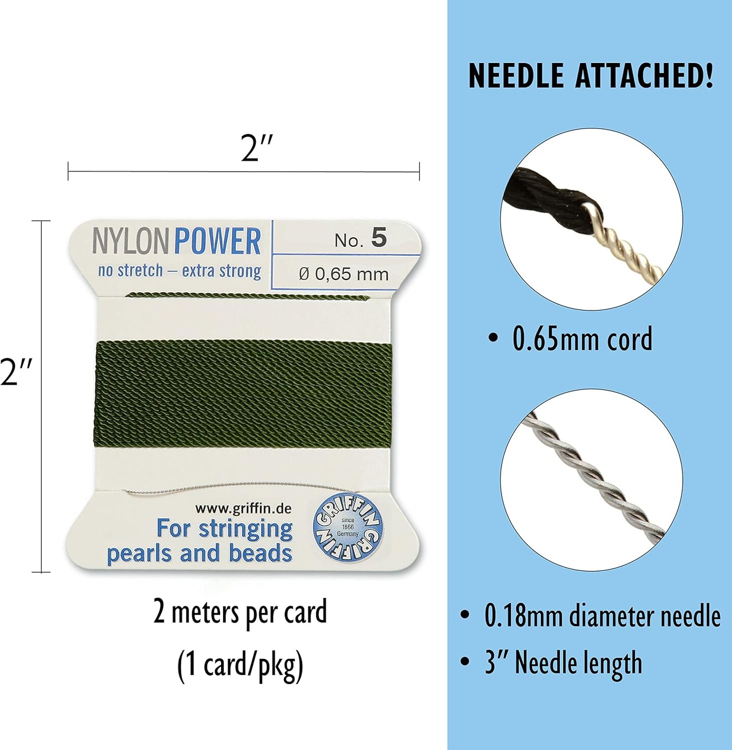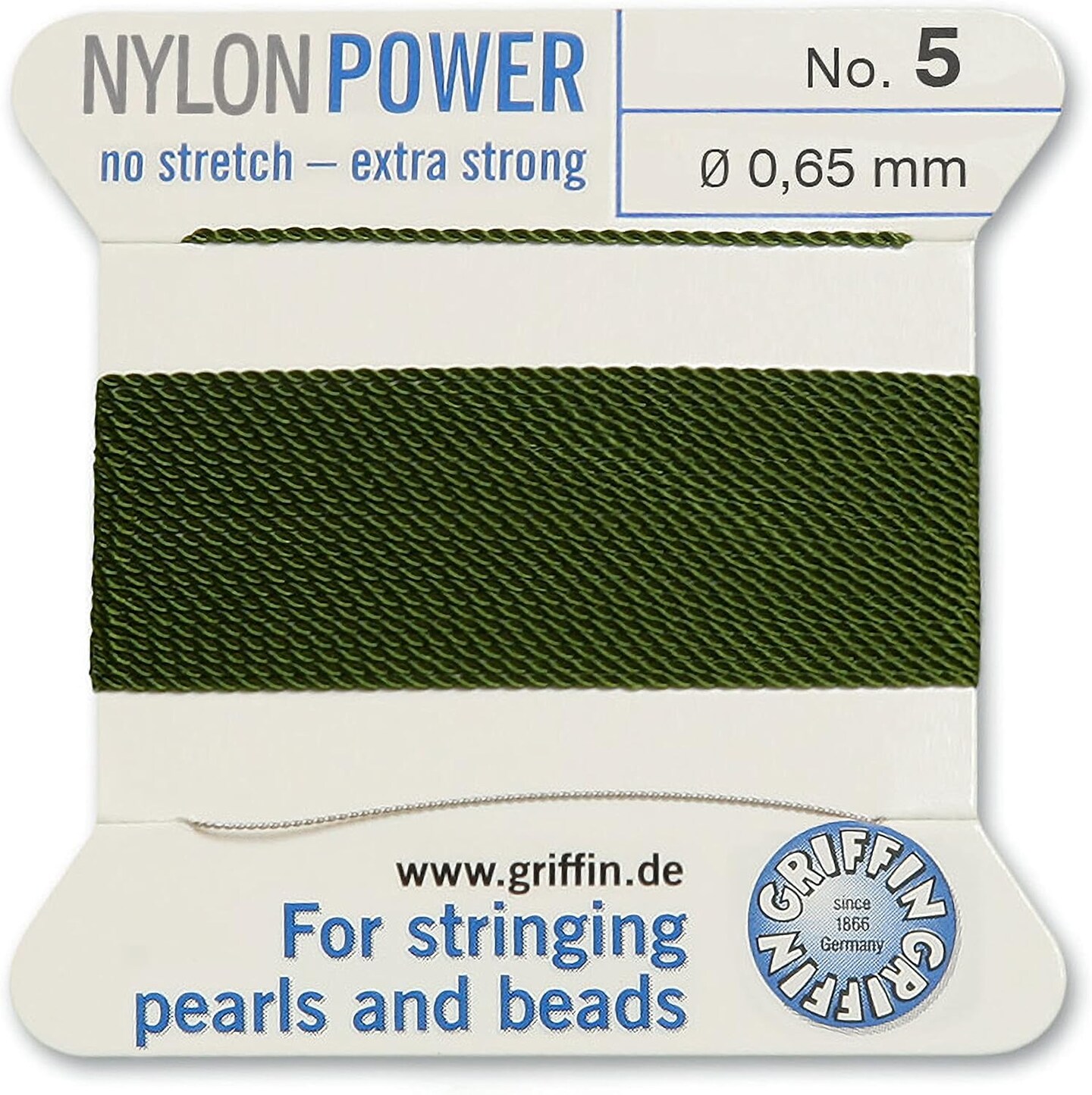 Griffin Nylon Bead Cord Perlseide – Size 5 (0.65mm) – 2 Meters per Card – Stainless Steel Needle Attached – for Knotting Pearls, Gemstones, Crystals and Beads