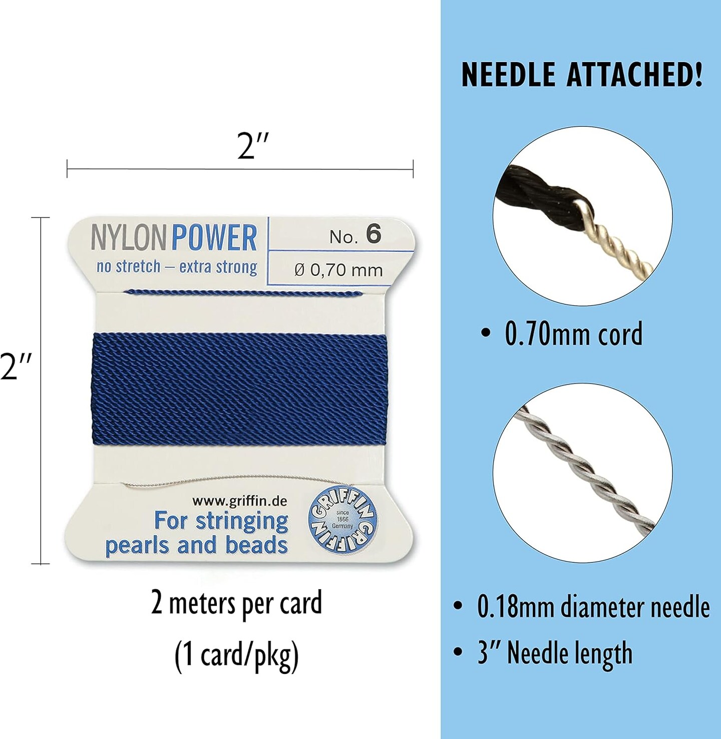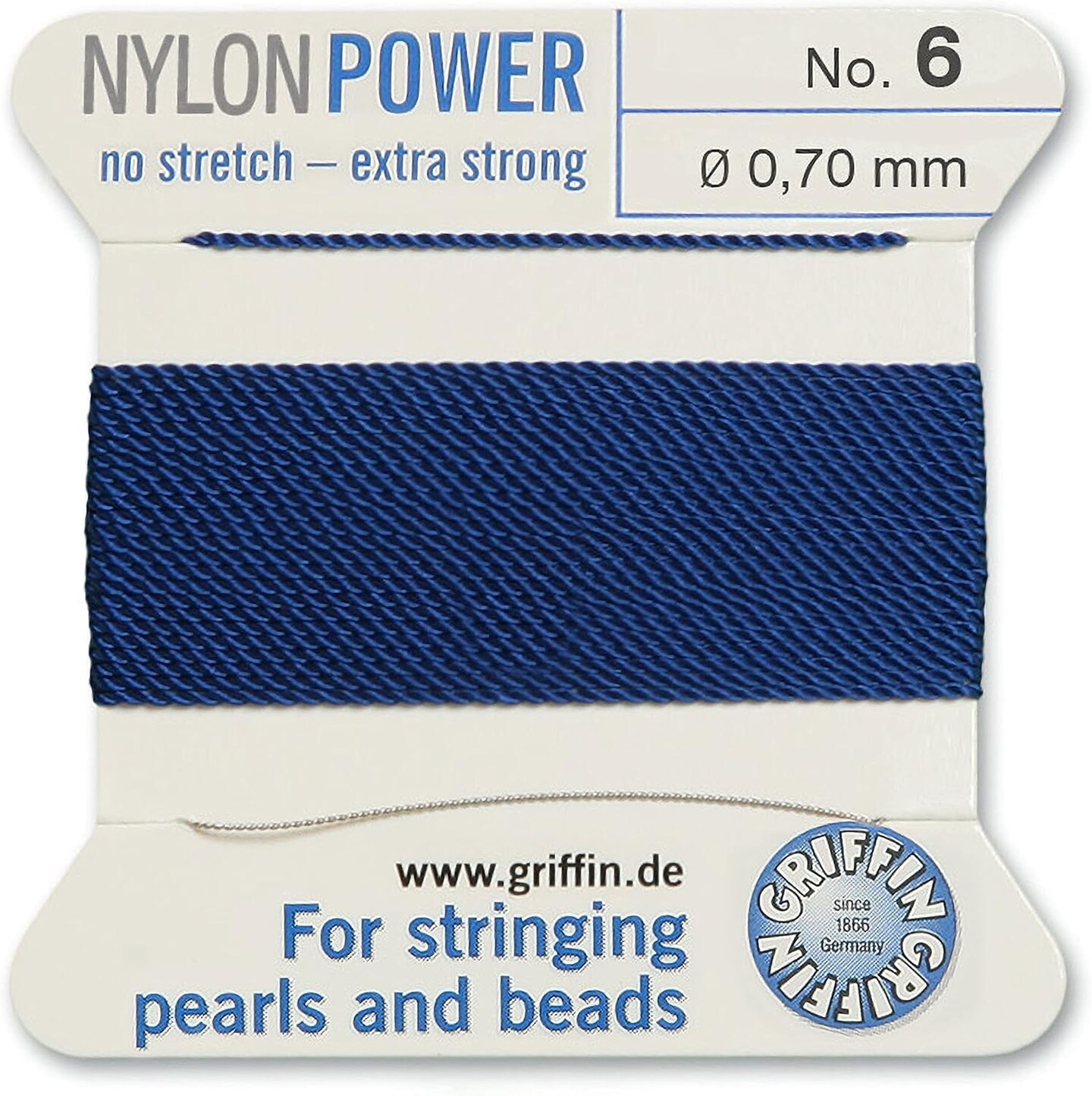 Griffin Nylon Bead Cord Perlseide – Size 6 (0.70mm) – 2 Meters per Card – Stainless Steel Needle Attached – for Knotting Pearls, Gemstones, Crystals and Beads