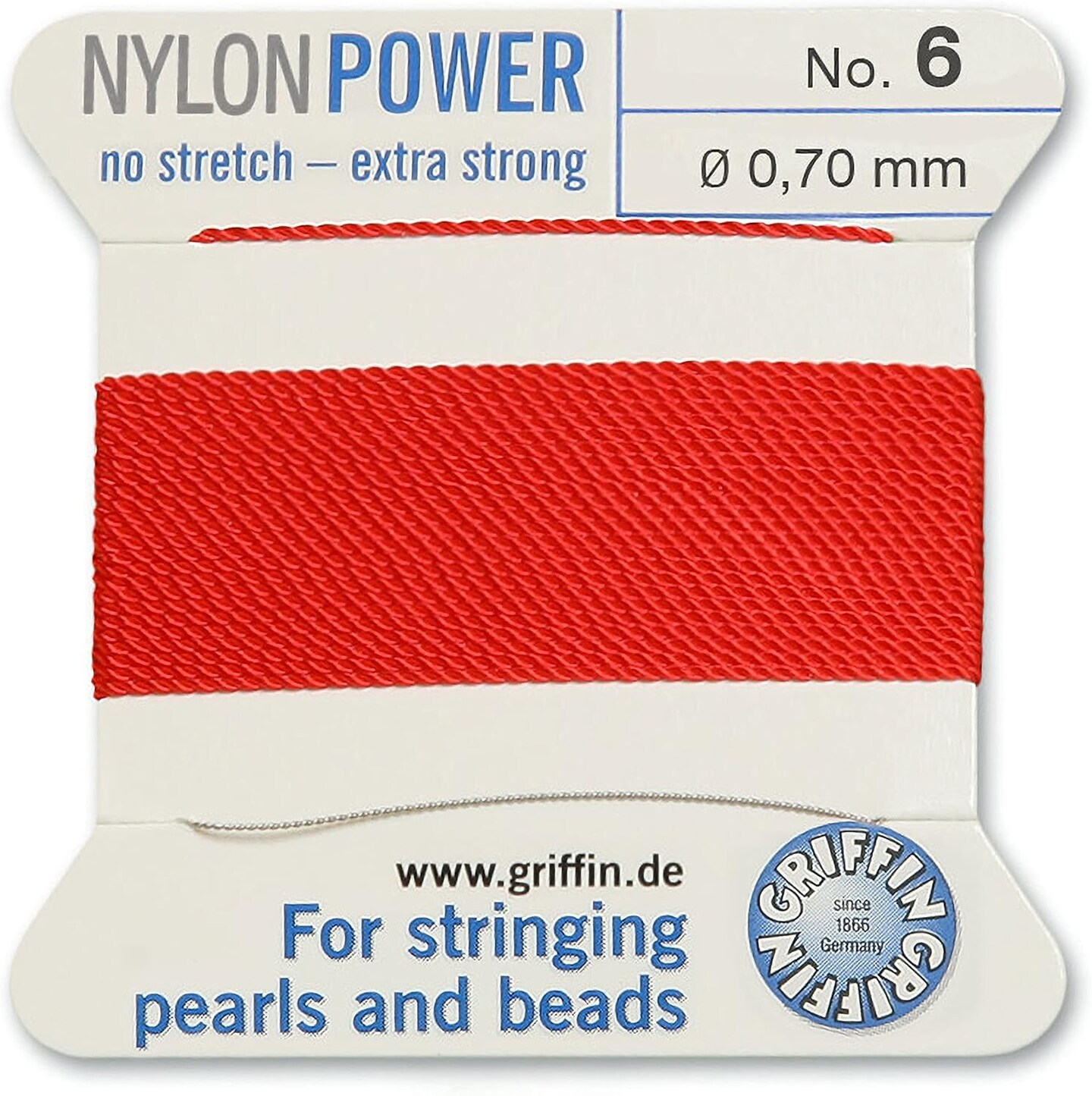 Griffin Nylon Bead Cord Perlseide – Size 6 (0.70mm) – 2 Meters per Card – Stainless Steel Needle Attached – for Knotting Pearls, Gemstones, Crystals and Beads