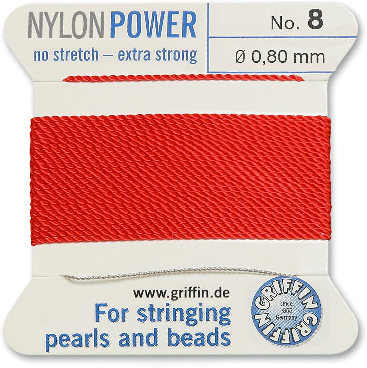 Griffin Nylon Bead Cord Perlseide – Size 8 (0.80mm) – 2 Meters per Card – Stainless Steel Needle Attached – for Knotting Pearls, Gemstones, Crystals and Beads