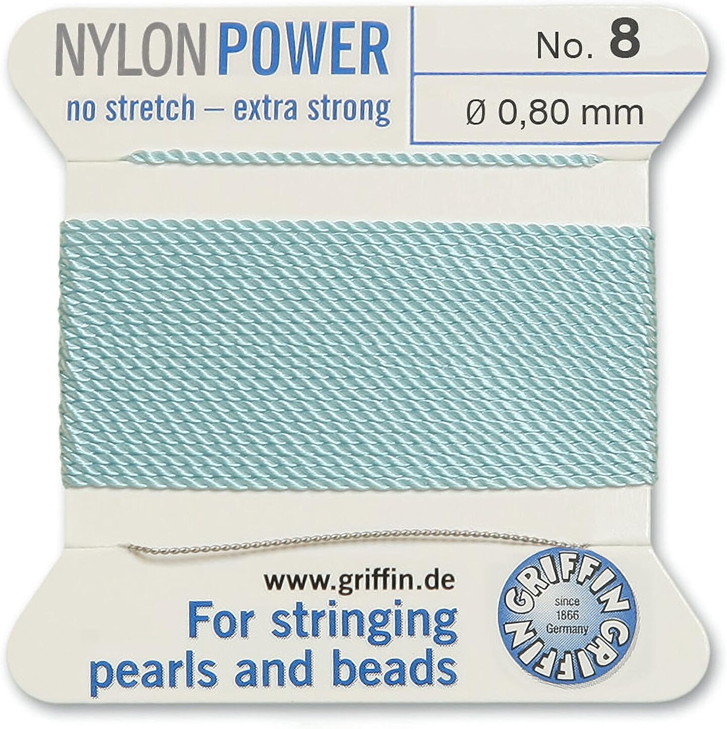 Griffin Nylon Bead Cord Perlseide – Size 8 (0.80mm) – 2 Meters per Card – Stainless Steel Needle Attached – for Knotting Pearls, Gemstones, Crystals and Beads