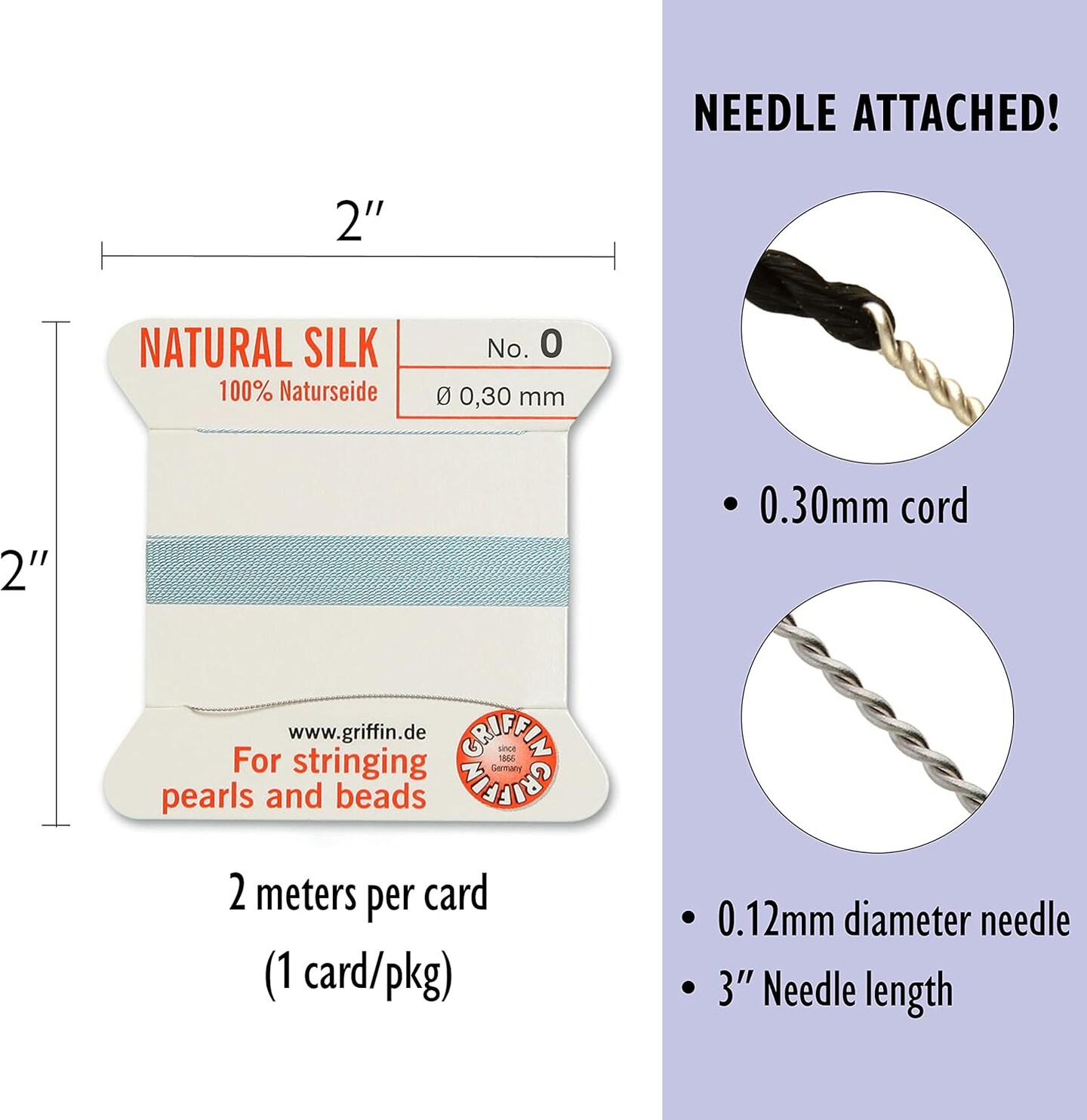 Griffin Silk Bead Cord Perlseide – Size 0 (0.30mm) – 2 Meters per Card – Stainless Steel Needle Attached – for Knotting Pearls, Gemstones, Crystals and Beads