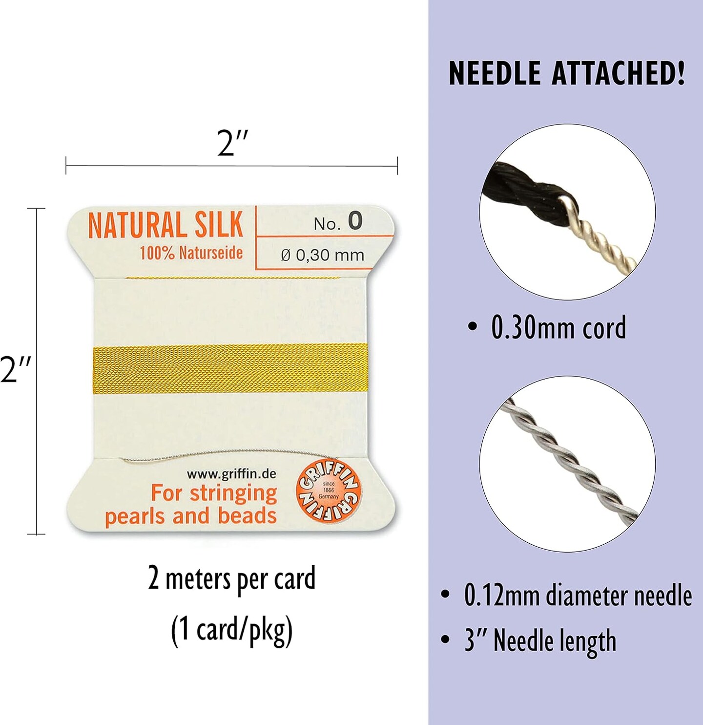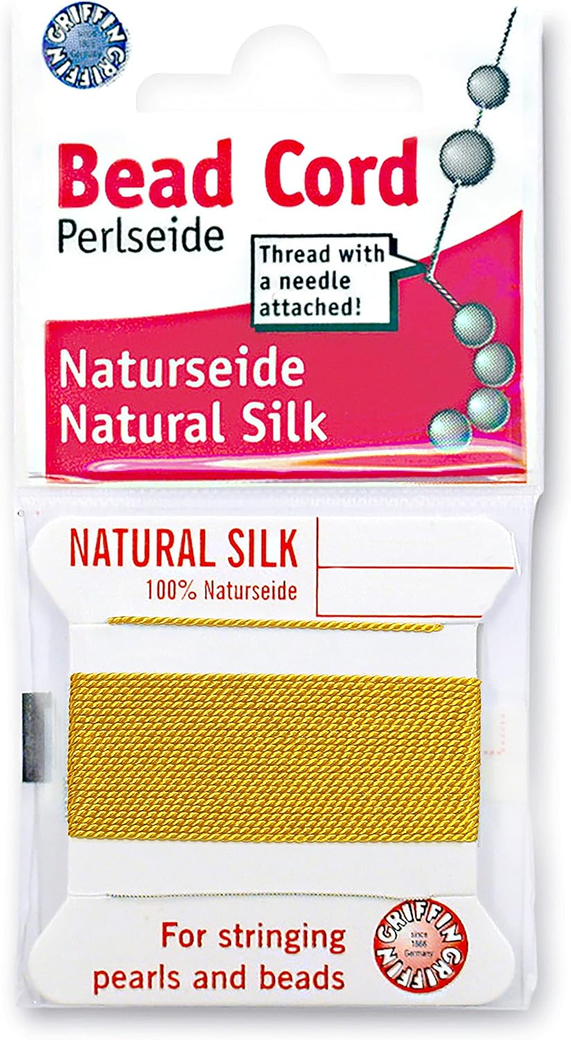 Griffin Silk Bead Cord Perlseide – Size 0 (0.30mm) – 2 Meters per Card – Stainless Steel Needle Attached – for Knotting Pearls, Gemstones, Crystals and Beads