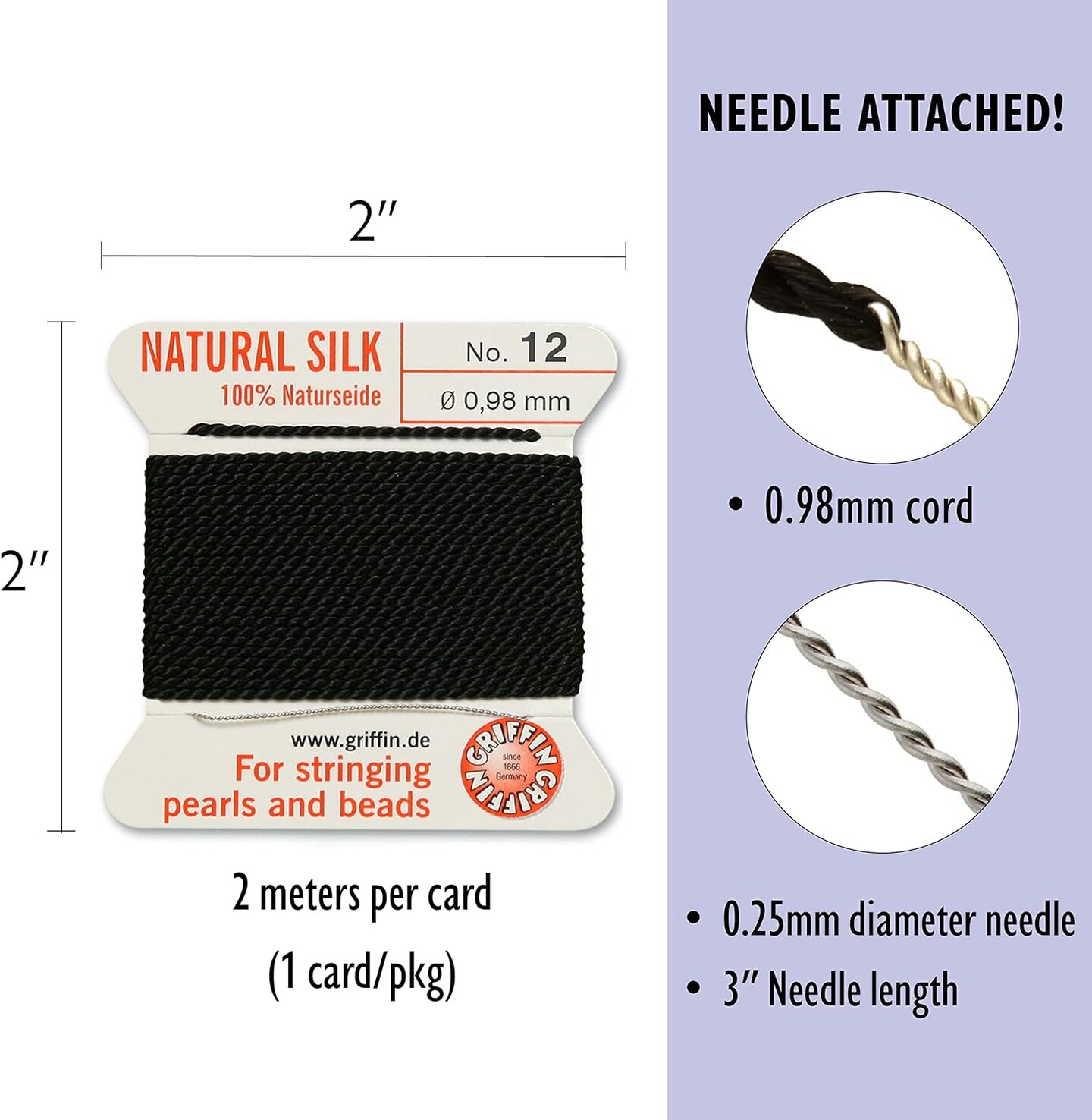 Griffin Silk Bead Cord Perlseide – Size 12 (0.98mm) – 2 Meters per Card – Stainless Steel Needle Attached – for Knotting Pearls, Gemstones, Crystals and Beads