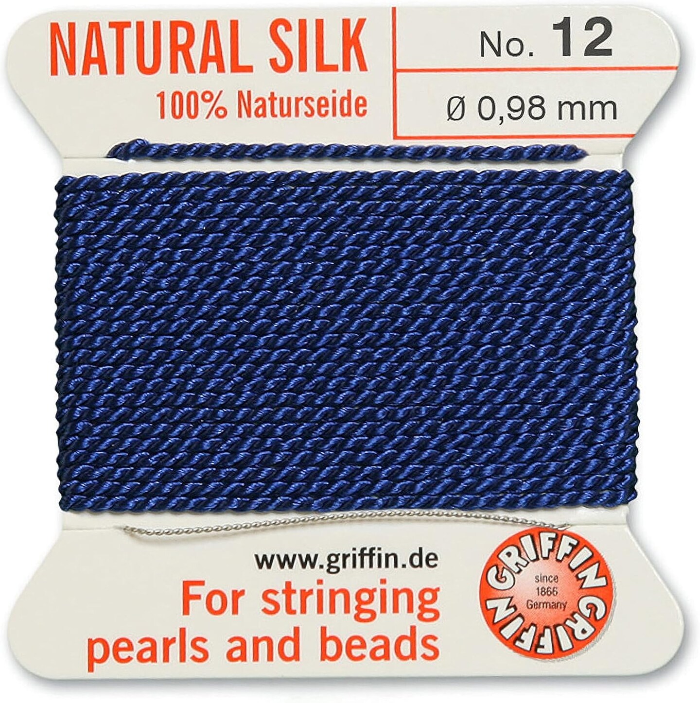 Griffin Silk Bead Cord Perlseide – Size 12 (0.98mm) – 2 Meters per Card – Stainless Steel Needle Attached – for Knotting Pearls, Gemstones, Crystals and Beads