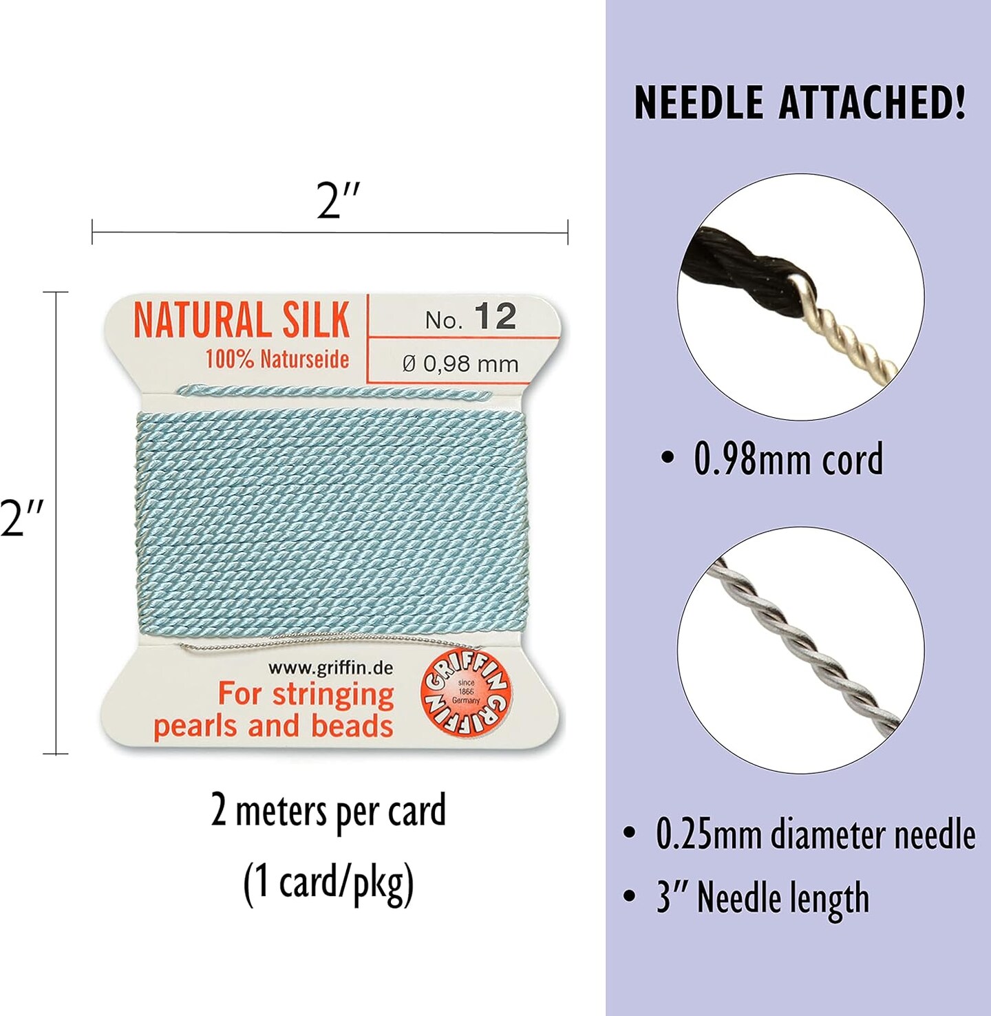 Griffin Silk Bead Cord Perlseide – Size 12 (0.98mm) – 2 Meters per Card – Stainless Steel Needle Attached – for Knotting Pearls, Gemstones, Crystals and Beads