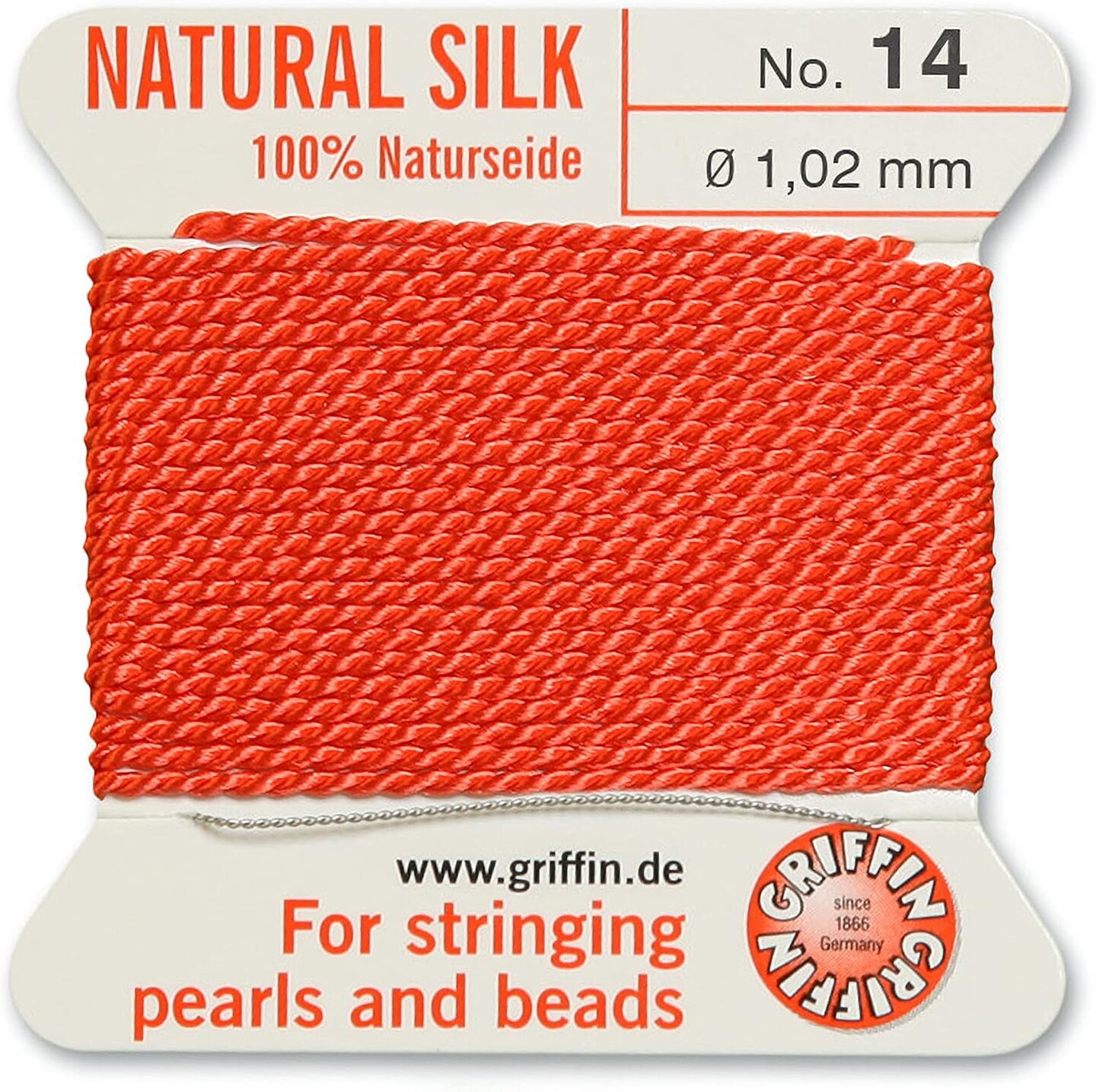 Griffin Silk Bead Cord Perlseide – Size 14 (1.02mm) – 2 Meters per Card – Stainless Steel Needle Attached – for Knotting Pearls, Gemstones, Crystals and Beads