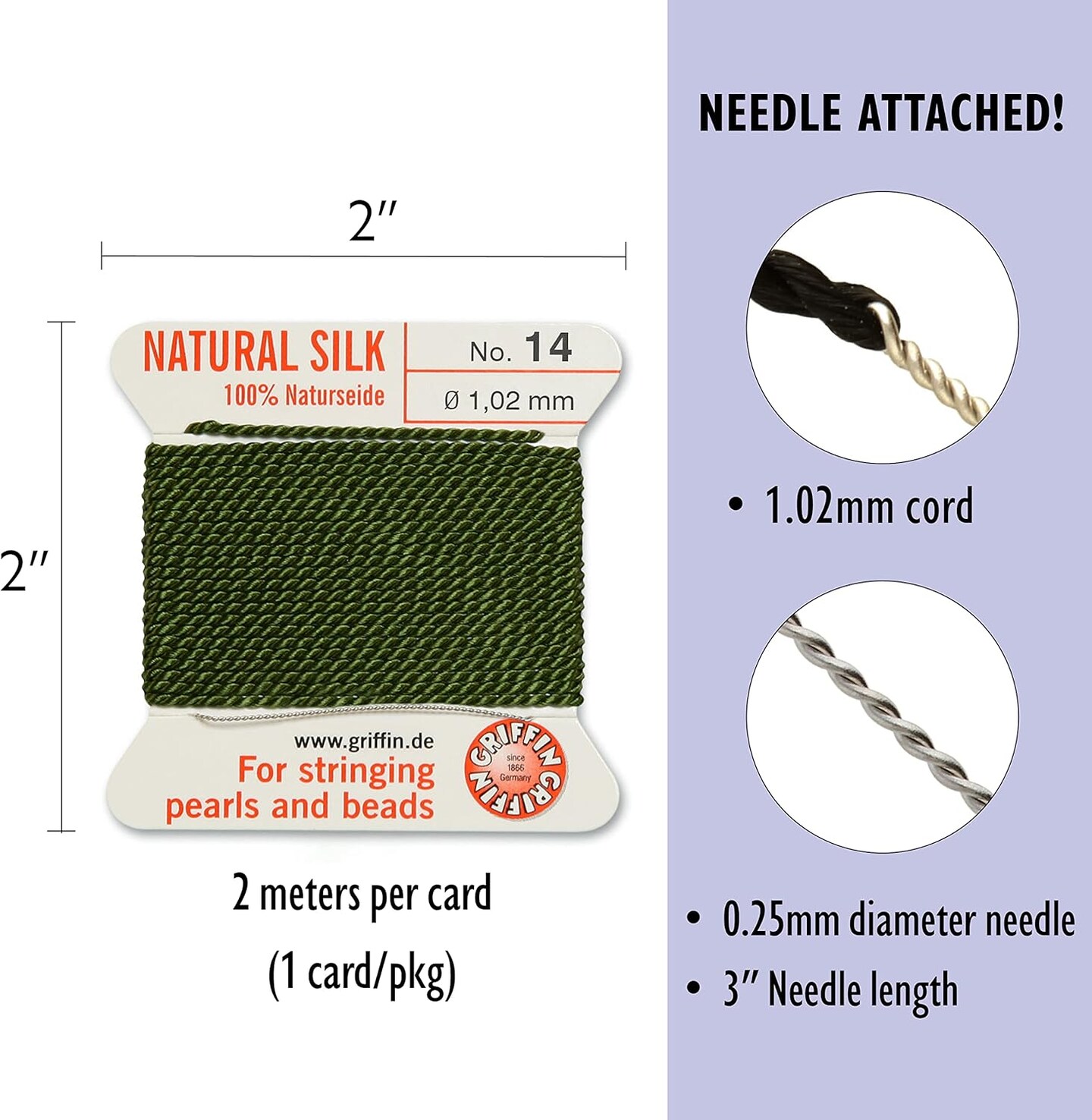 Griffin Silk Bead Cord Perlseide – Size 14 (1.02mm) – 2 Meters per Card – Stainless Steel Needle Attached – for Knotting Pearls, Gemstones, Crystals and Beads