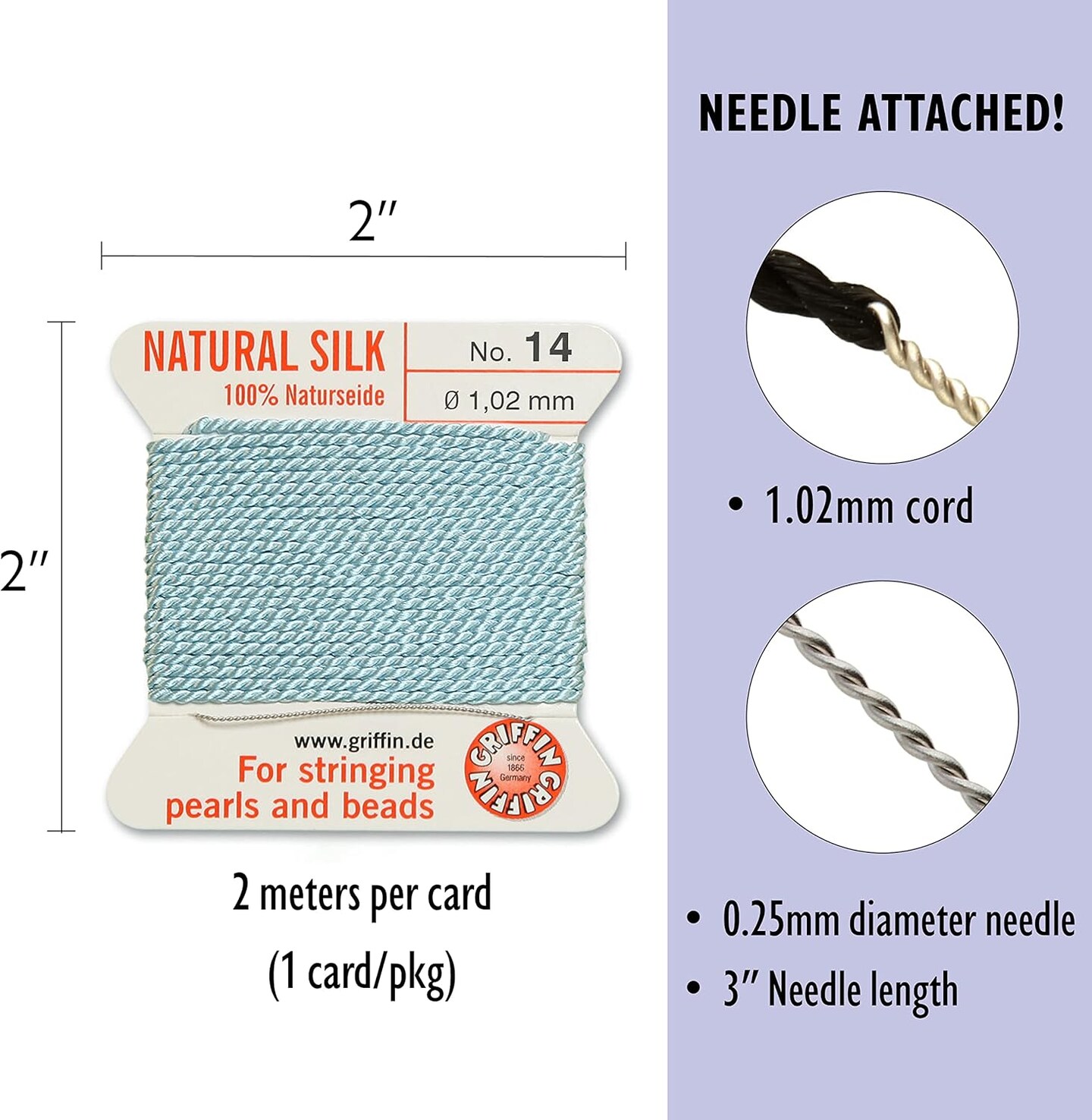Griffin Silk Bead Cord Perlseide – Size 14 (1.02mm) – 2 Meters per Card – Stainless Steel Needle Attached – for Knotting Pearls, Gemstones, Crystals and Beads