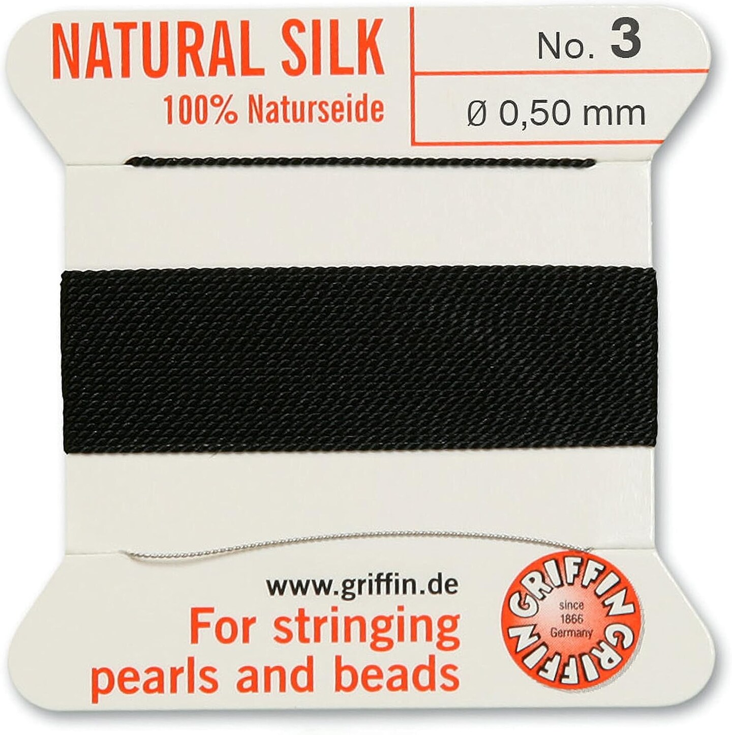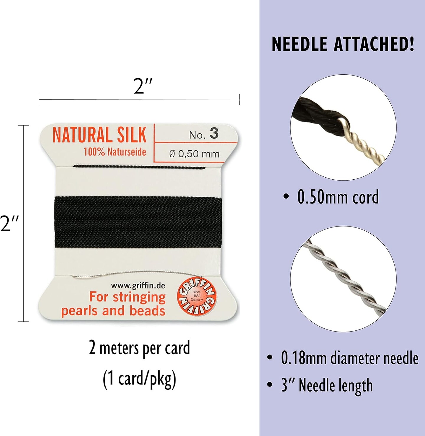 Griffin Silk Bead Cord Perlseide – Size 3 (0.50mm) – 2 Meters per Card – Stainless Steel Needle Attached – for Knotting Pearls, Gemstones, Crystals and Beads