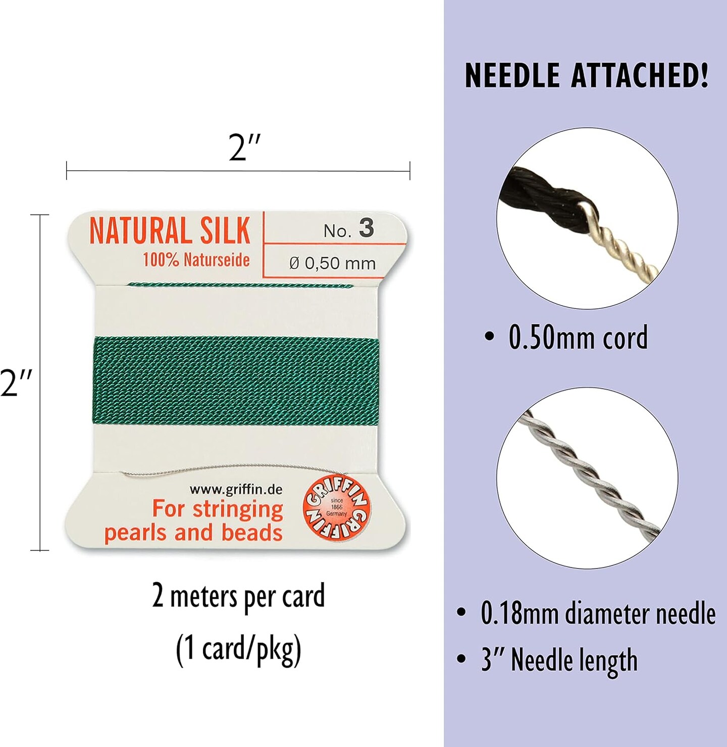 Griffin Silk Bead Cord Perlseide – Size 3 (0.50mm) – 2 Meters per Card – Stainless Steel Needle Attached – for Knotting Pearls, Gemstones, Crystals and Beads