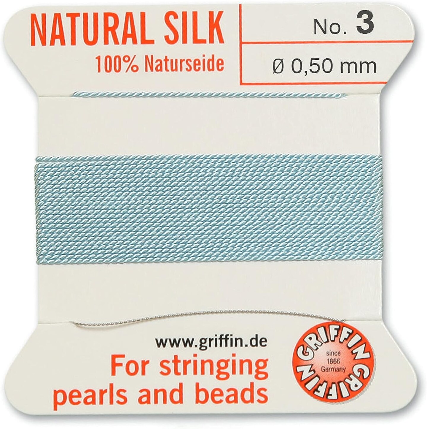 Griffin Silk Bead Cord Perlseide – Size 3 (0.50mm) – 2 Meters per Card – Stainless Steel Needle Attached – for Knotting Pearls, Gemstones, Crystals and Beads