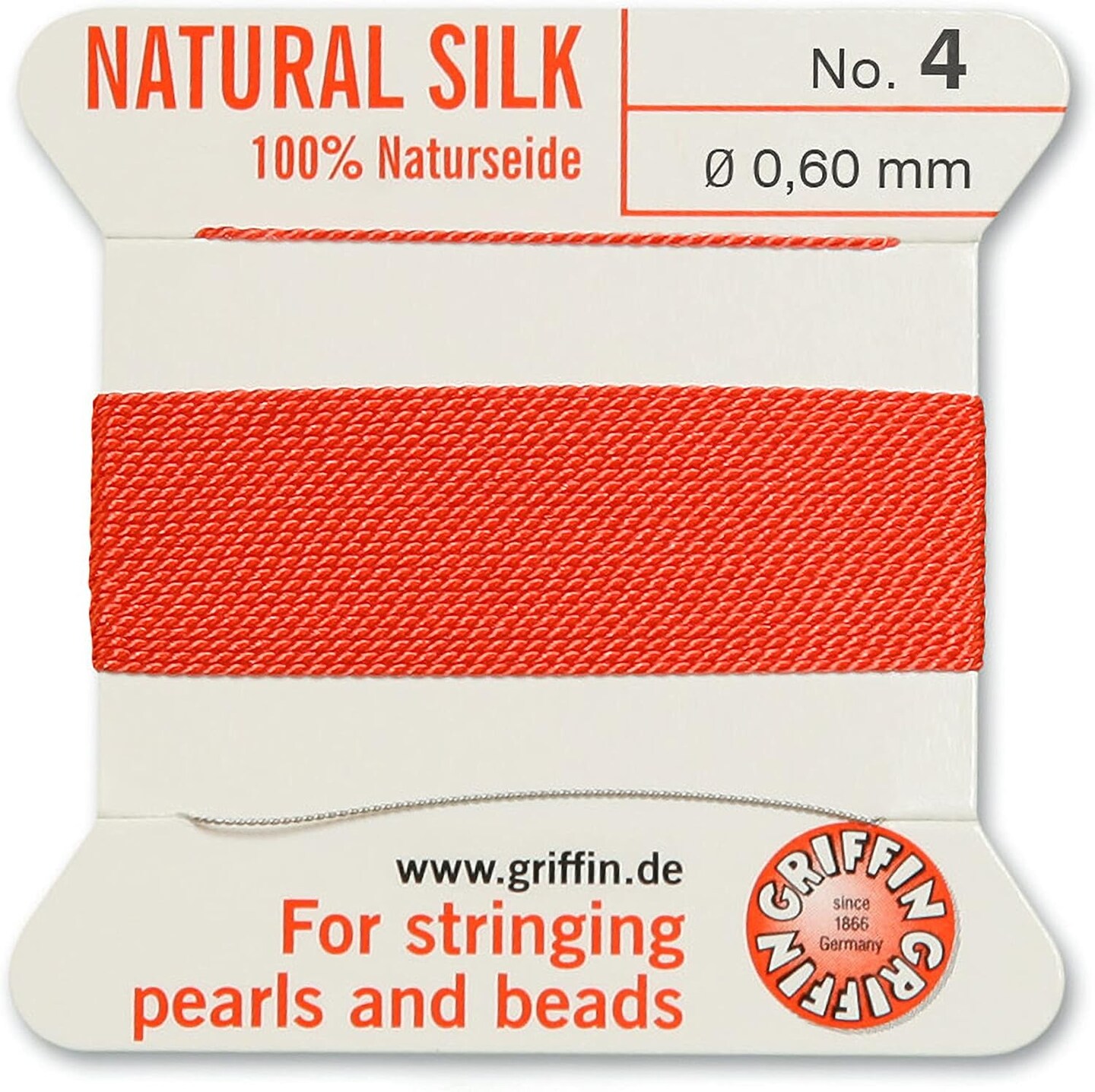 Griffin Silk Bead Cord Perlseide – Size 4 (0.60mm) – 2 Meters per Card – Stainless Steel Needle Attached – for Knotting Pearls, Gemstones, Crystals and Beads