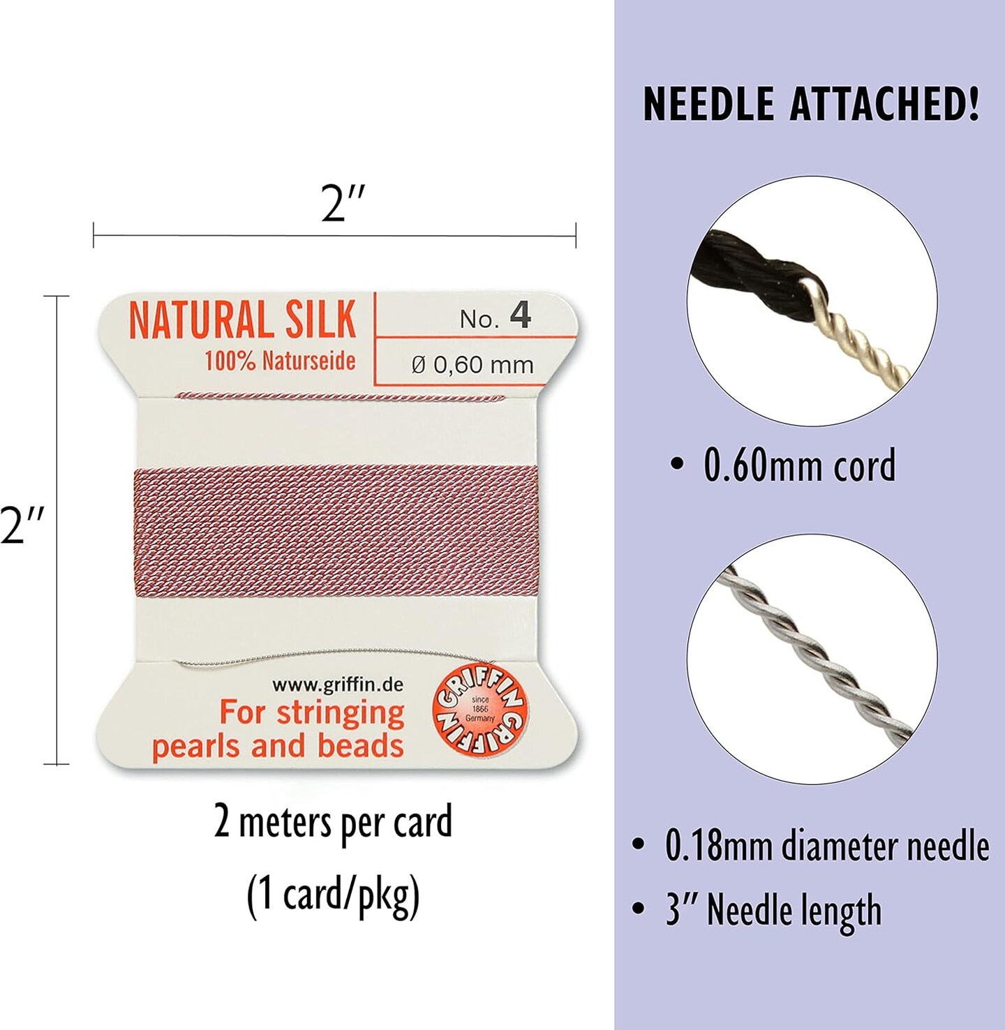 Griffin Silk Bead Cord Perlseide – Size 4 (0.60mm) – 2 Meters per Card – Stainless Steel Needle Attached – for Knotting Pearls, Gemstones, Crystals and Beads