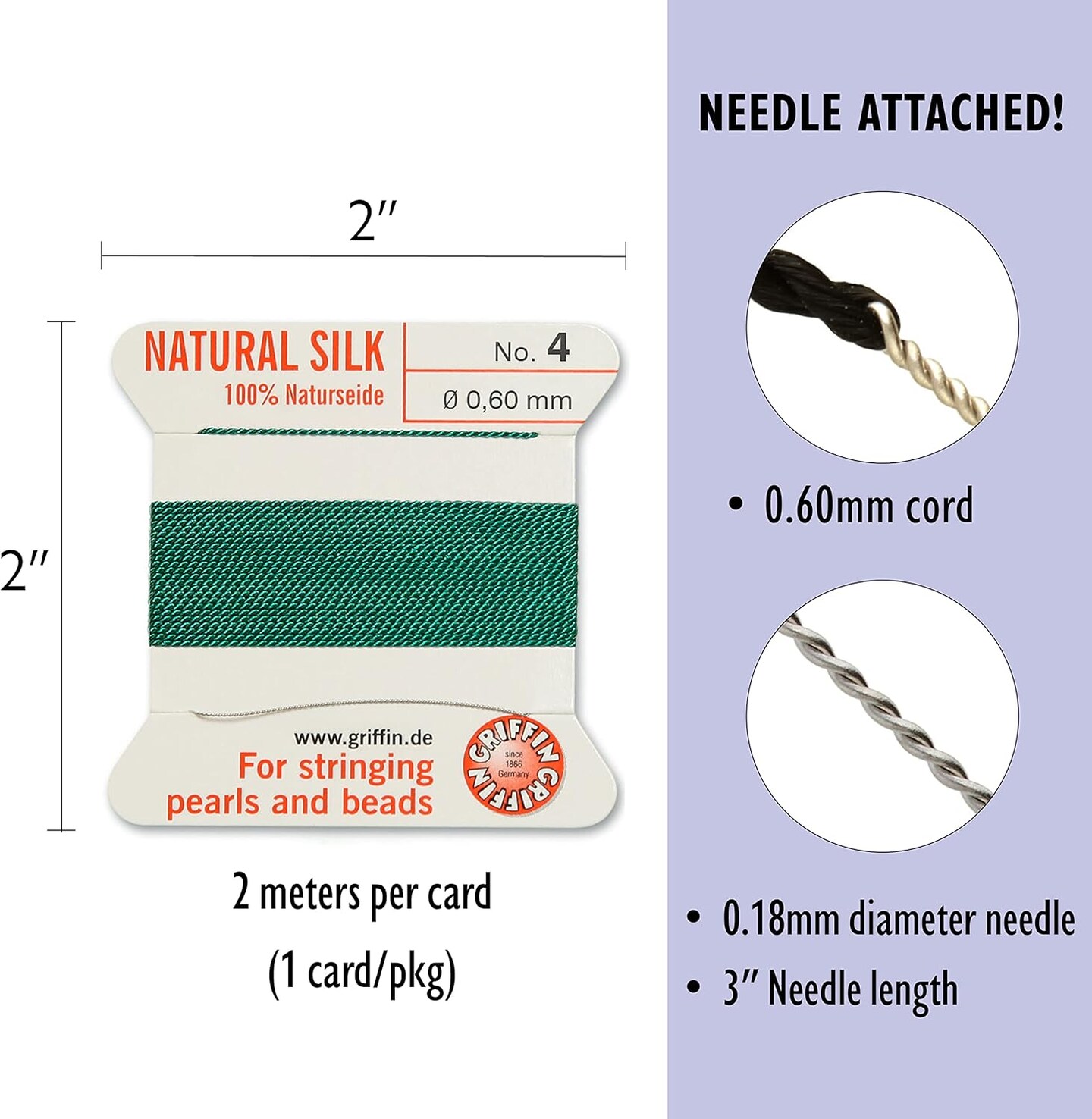 Griffin Silk Bead Cord Perlseide – Size 4 (0.60mm) – 2 Meters per Card – Stainless Steel Needle Attached – for Knotting Pearls, Gemstones, Crystals and Beads