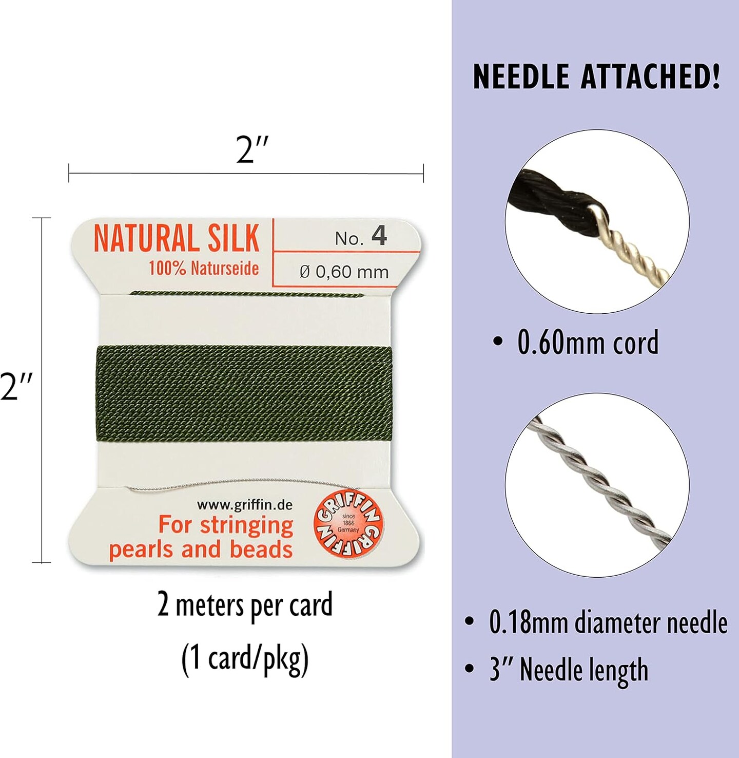Griffin Silk Bead Cord Perlseide – Size 4 (0.60mm) – 2 Meters per Card – Stainless Steel Needle Attached – for Knotting Pearls, Gemstones, Crystals and Beads