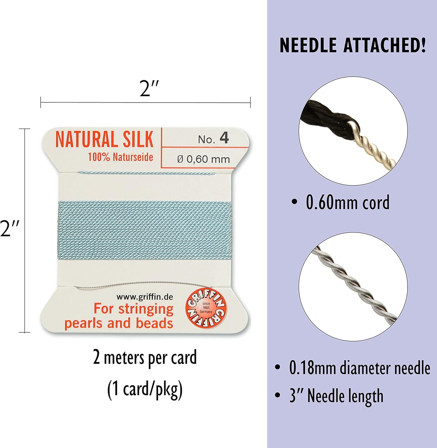 Griffin Silk Bead Cord Perlseide – Size 4 (0.60mm) – 2 Meters per Card – Stainless Steel Needle Attached – for Knotting Pearls, Gemstones, Crystals and Beads