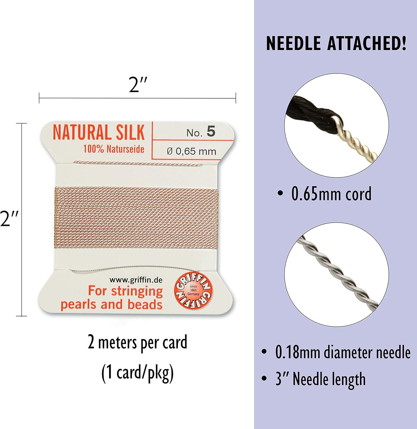 Griffin Silk Bead Cord Perlseide – Size 5 (0.65mm) – 2 Meters per Card – Stainless Steel Needle Attached – for Knotting Pearls, Gemstones, Crystals and Beads