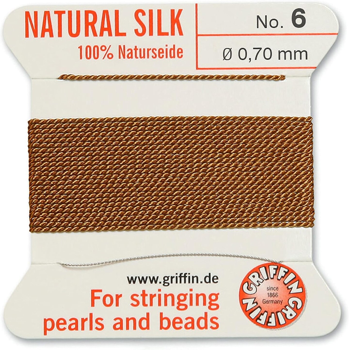 Griffin Silk Bead Cord Perlseide – Size 6 (0.70mm) – 2 Meters per Card – Stainless Steel Needle Attached – for Knotting Pearls, Gemstones, Crystals and Beads