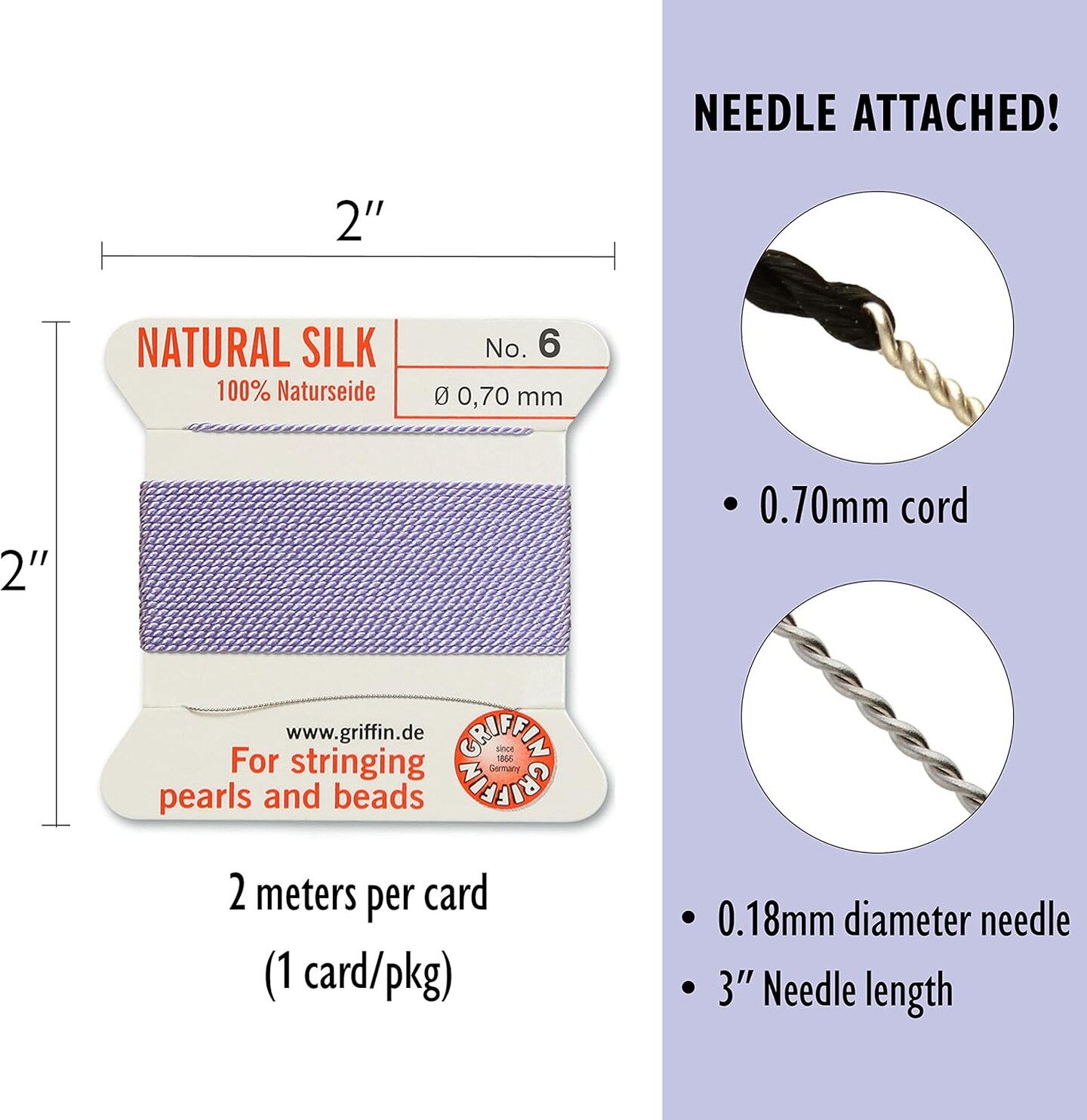 Griffin Silk Bead Cord Perlseide – Size 6 (0.70mm) – 2 Meters per Card – Stainless Steel Needle Attached – for Knotting Pearls, Gemstones, Crystals and Beads