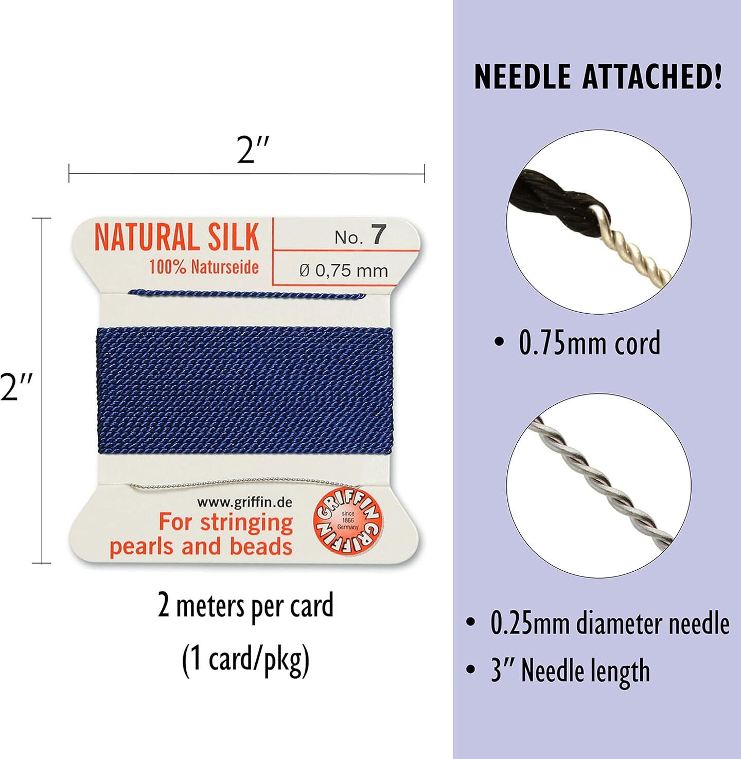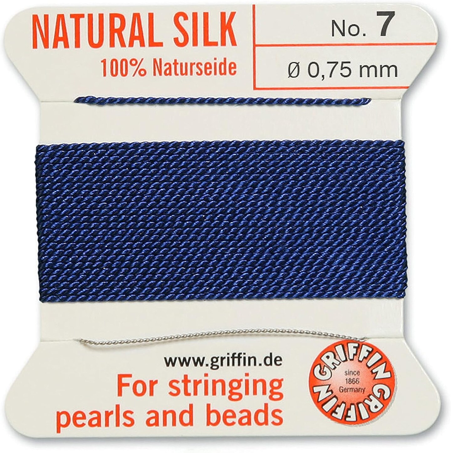 Griffin Silk Bead Cord Perlseide – Size 7 (0.75mm) – 2 Meters per Card – Stainless Steel Needle Attached – for Knotting Pearls, Gemstones, Crystals and Beads