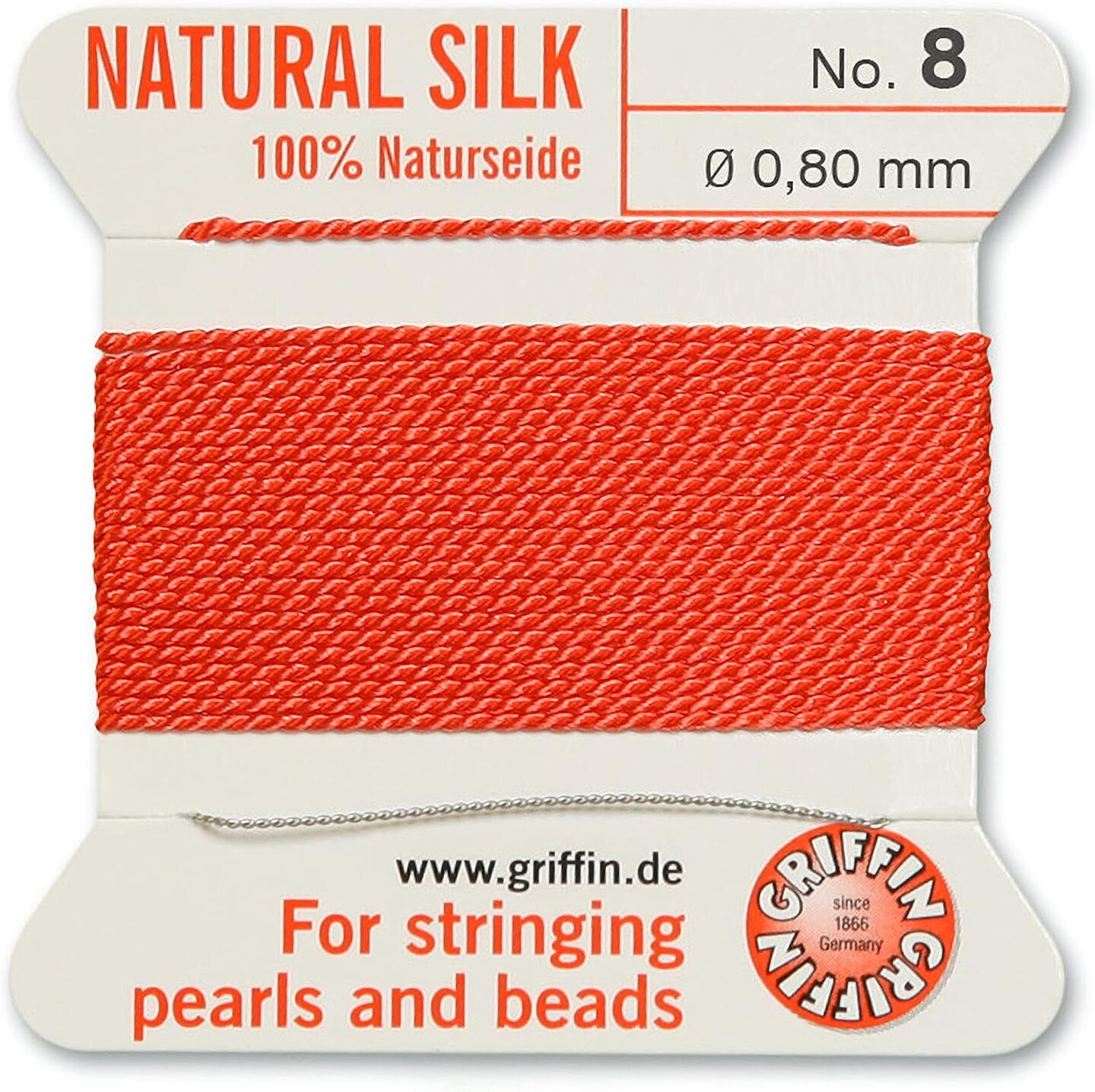 Griffin Silk Bead Cord Perlseide – Size 8 (0.80mm) – 2 Meters per Card – Stainless Steel Needle Attached – for Knotting Pearls, Gemstones, Crystals and Beads