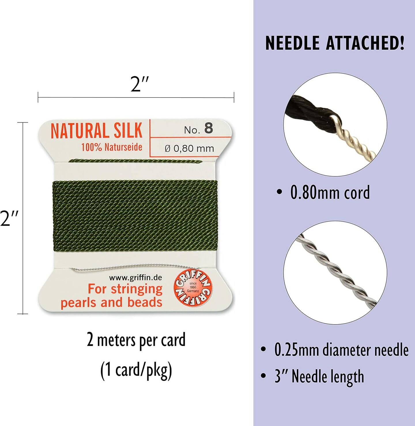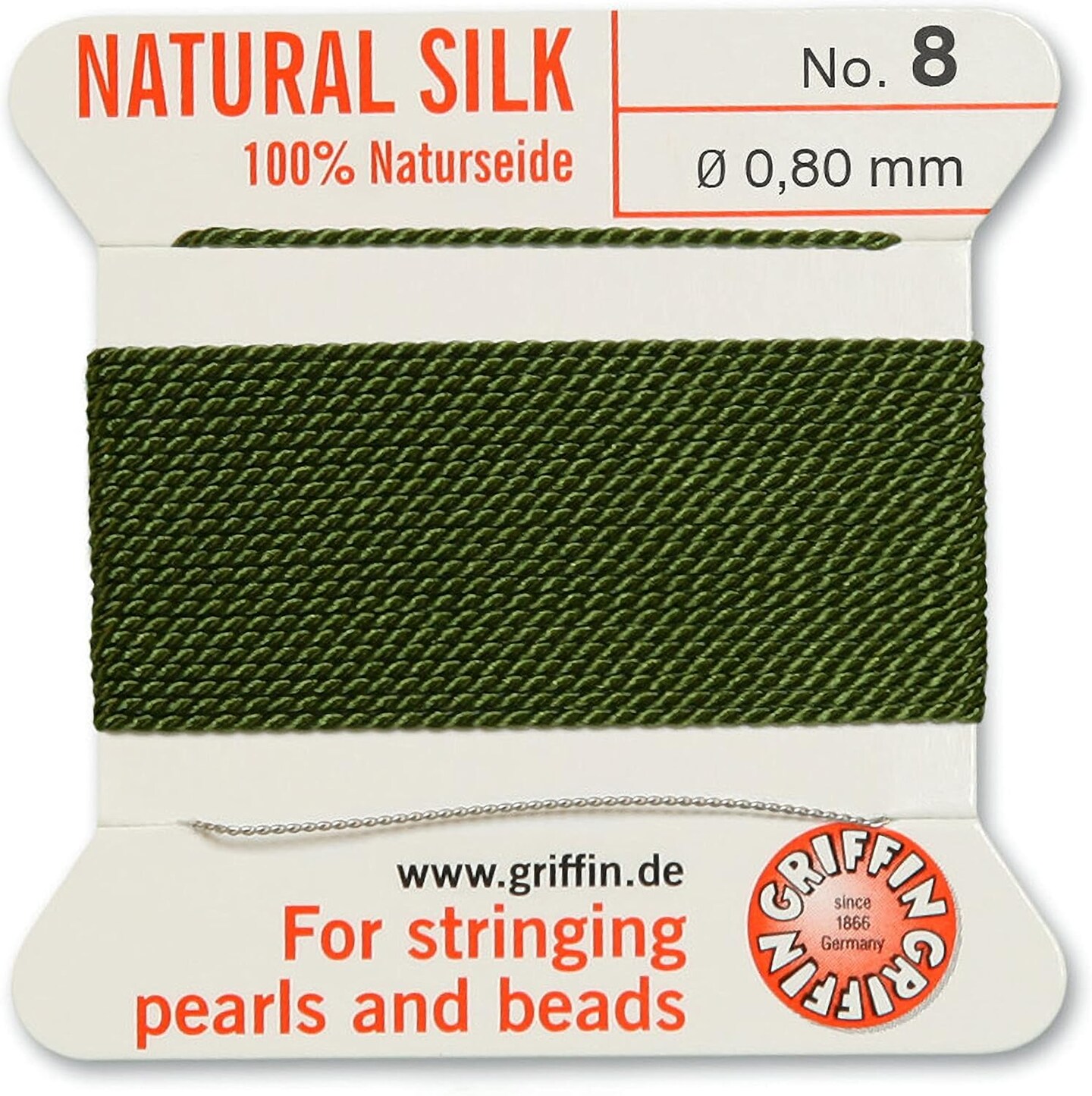 Griffin Silk Bead Cord Perlseide – Size 8 (0.80mm) – 2 Meters per Card – Stainless Steel Needle Attached – for Knotting Pearls, Gemstones, Crystals and Beads